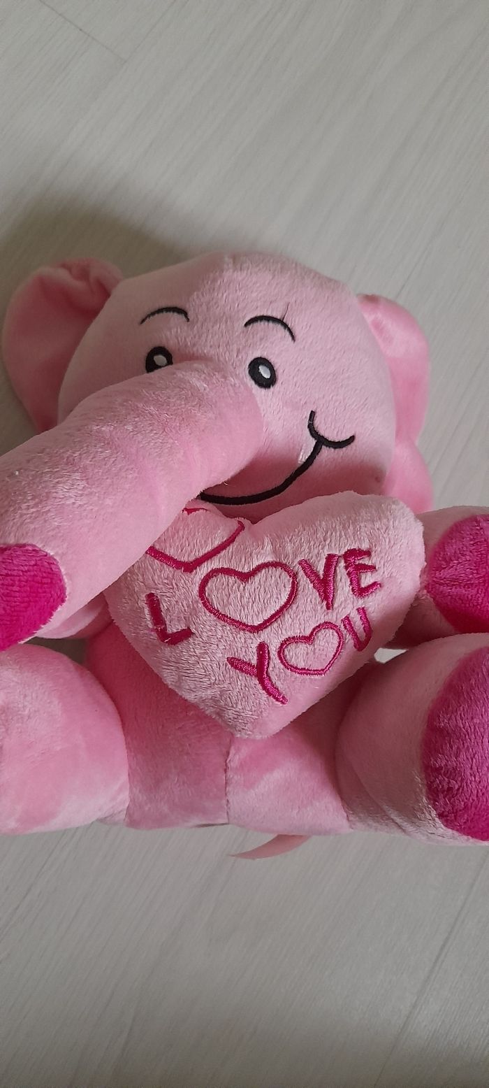 Peluche éléphant Couleur rose Inscription sur le cœur ( LOVE YOU) Hauteur assis 25 cm environ Neuf