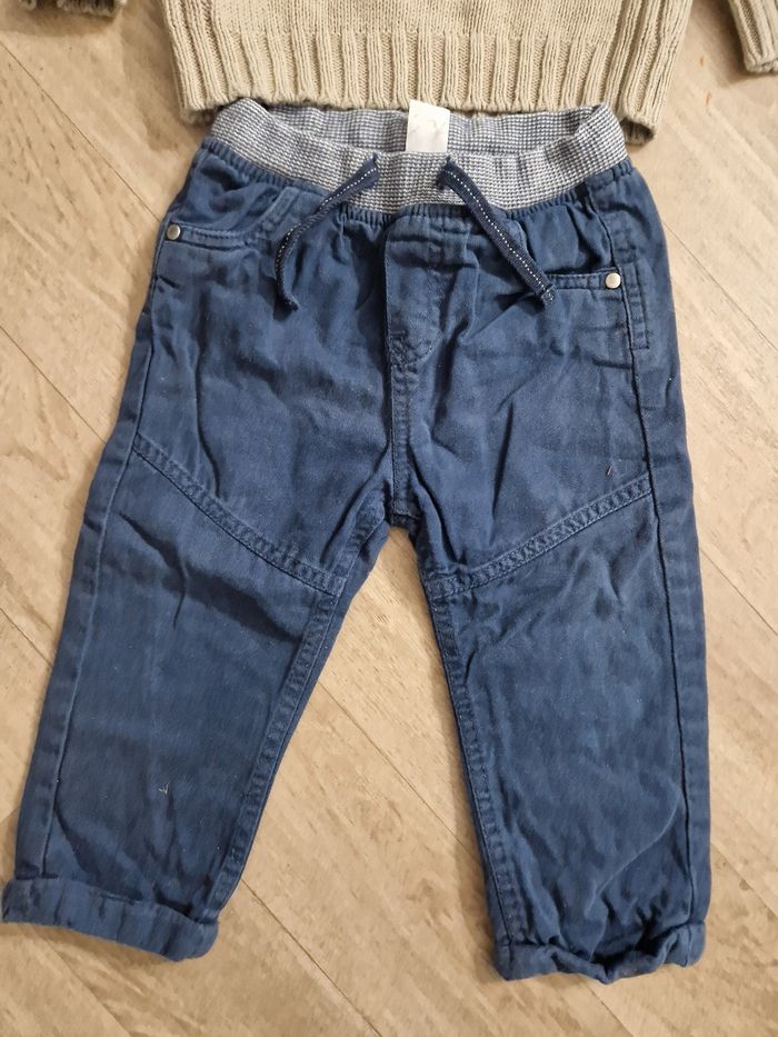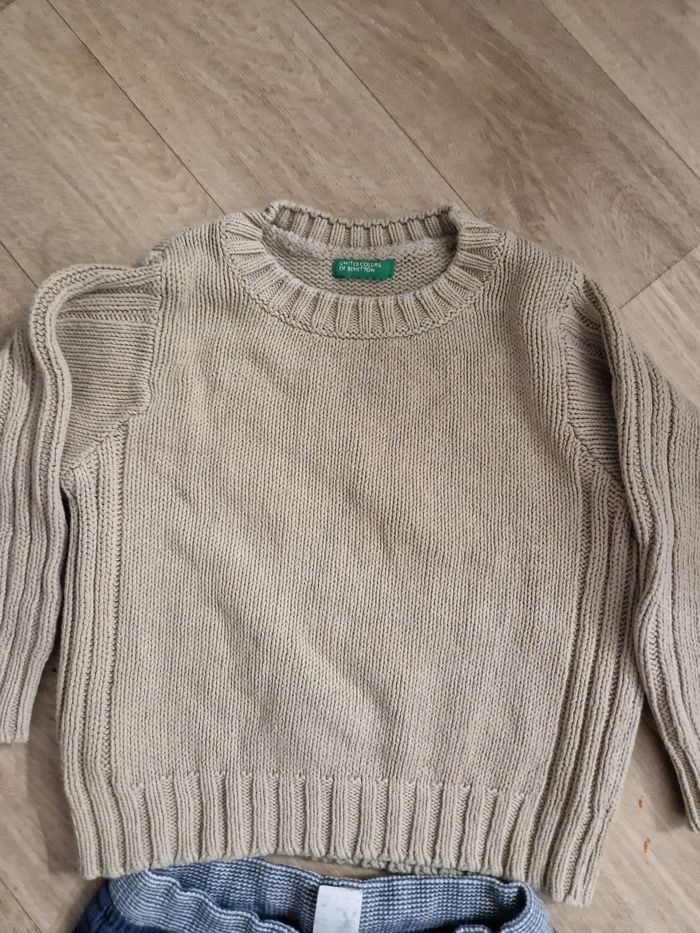 Lot de 5 vêtements bébé garçon de 18 mois comprenant : - 1 pantalon en tissu bleu marine de la marque Mots d'enfant - 1 salopette moutarde en matière légère de la marque Kiabi - 2 bodies a manches courtes tape à l'œil qui sont légèrement tachés - 1 t-shirt à manches courtes bleu marine de la marque Kiabi - 1 pull de la marque United Color of Benetton Tout est en très bon état, sans trous ni taches d'usures, sauf les bodies. Possibilité de casser le lot. N'hésitez pas à me demander si vous souhaitez plus d'informations ou de photos 🙂
