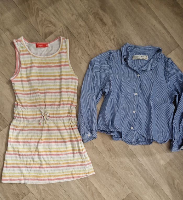 Lot vêtements pour fille en taille 5 ans comprenant : - 1 short jaune de la marque Okaidi - 1 T-shirt bleu marine de la marque LPC Girls - 1 robe à rayures de la marque Tisaïa - 1 jupe violette de la marque Tout Compte Fait - 1 t-shirt reine des neiges de la marque Disney - 1 chemise bleu à rayures blanches avec un col brodé de la marque Zara Tout est en très bon état, sans aucun trou ou taches d'usures. Possibilité de casser le lot. N'hésitez pas à me contacter pour plus d'informations ou photos 🙂