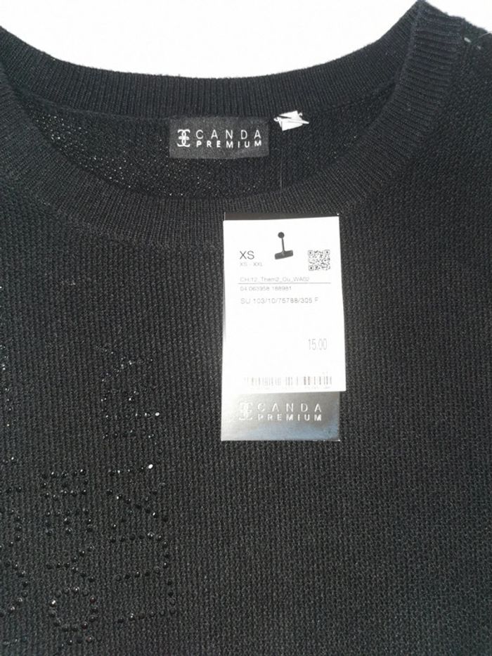 🙎‍♀️ ARTICLE NEUF AVEC ÉTIQUETTE 🙎‍♀️ Pull fin noir ⚫ C&A 👩 Canda Premium Taille XS • Matière: 46% nylon - 25% acrylique - 24% polyester - 5% laine • Col rond côtelé • Manches longues avec ligne blanche ⚪ • Inscriptions à strass noir ⚫️ à l'avant • 📏 Mesure sous aisselles: 44 cm • 📏 Longueur: 62 cm 💰 Prix boutique: 15€ Parfait état👌, avec étiquette 🏷, jamais porté #SoStyLifemmeTailleXS 🌫️