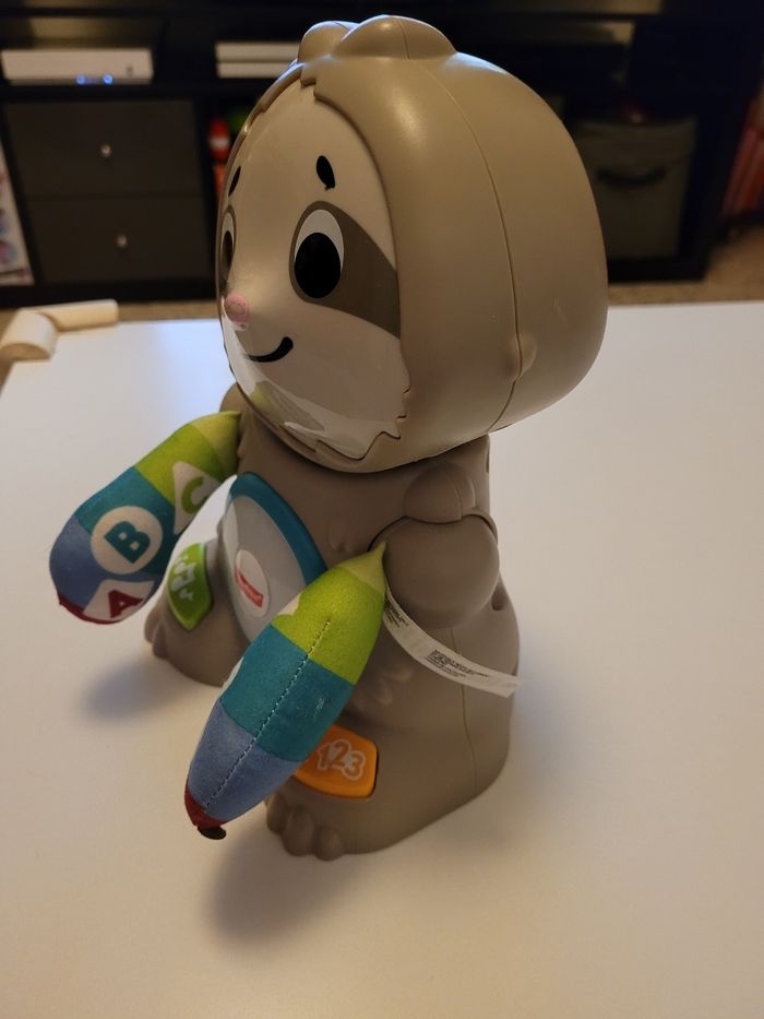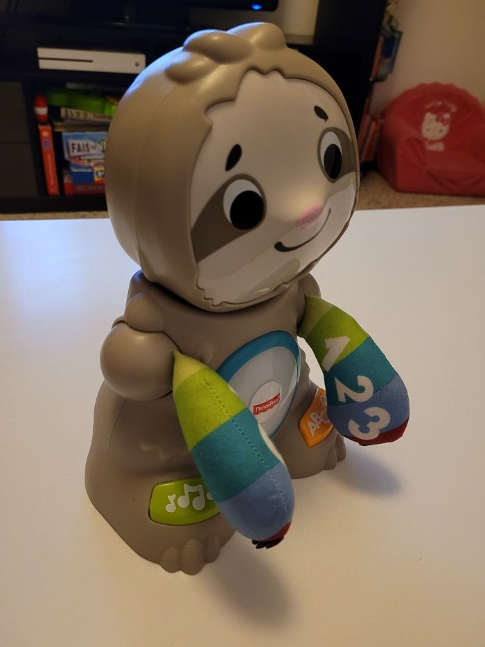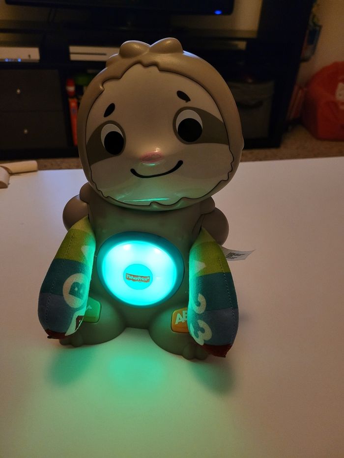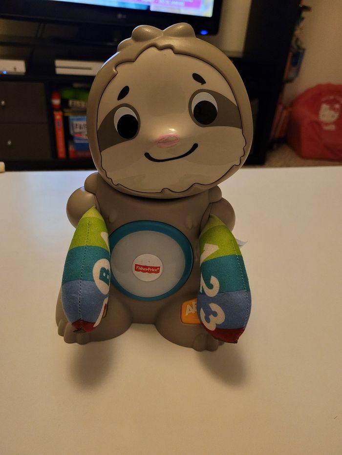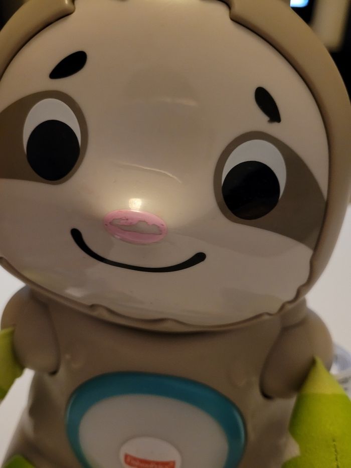 Paresseux Fisher price Normalement il bouge les bras et la tête avec petite musique...la non...les piles sont peut-être à changer ou ma fille la trop fait tombé...du coup il es moins brillant petit nez un peu effacé voir dernière photo