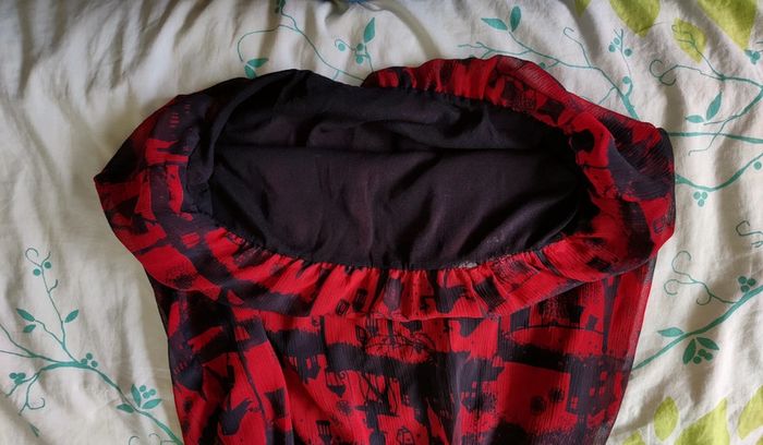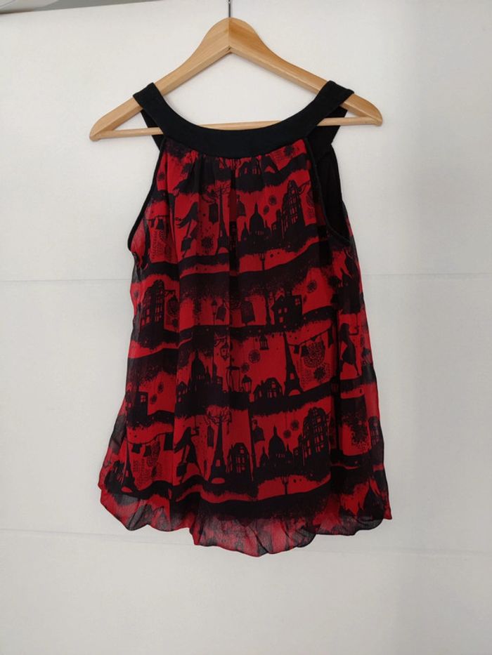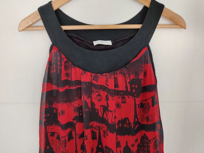 T-shirt débardeur Cache Cache rouge foncé avec motifs sur Paris en TBE (juste un tout petit défaut sous le TS qui ne se voit pas porté > voir photo), 38/40 - M. ☆Réduction pour les lots 😉 -> Autres articles ici : #drine35_femme (N'oubliez pas d'annuler tous les filtres sélectionnés pour tout voir).