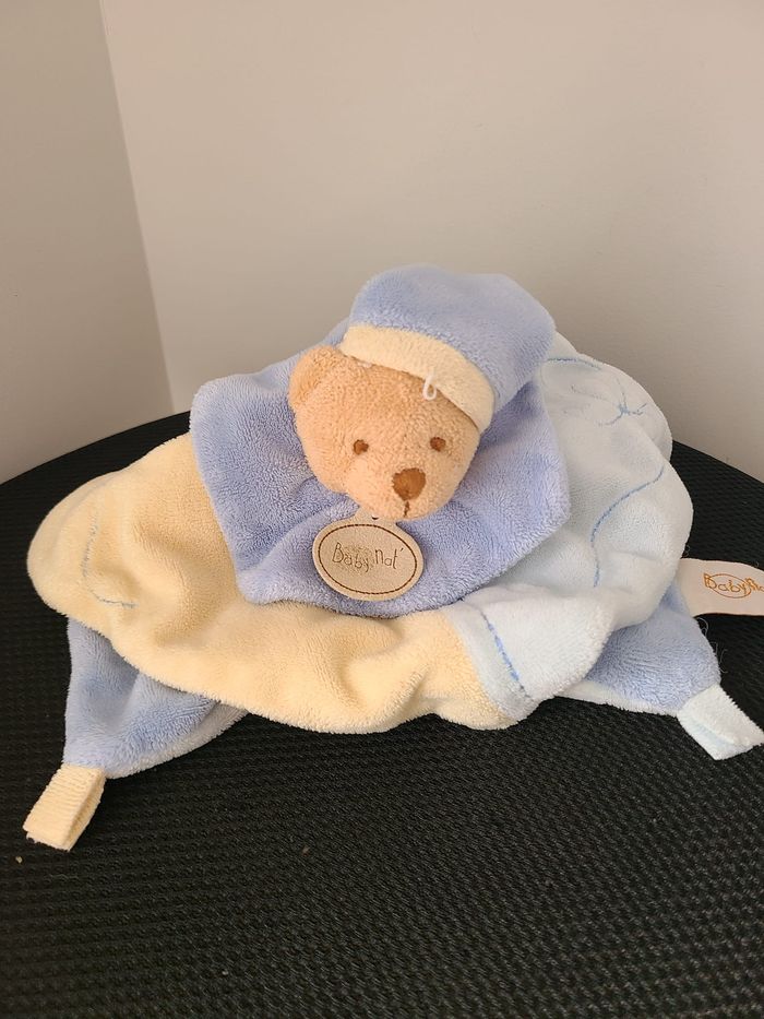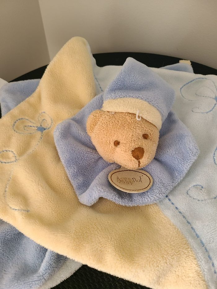 Ours BABY NAT doudou carré plat bleu et jaune 23