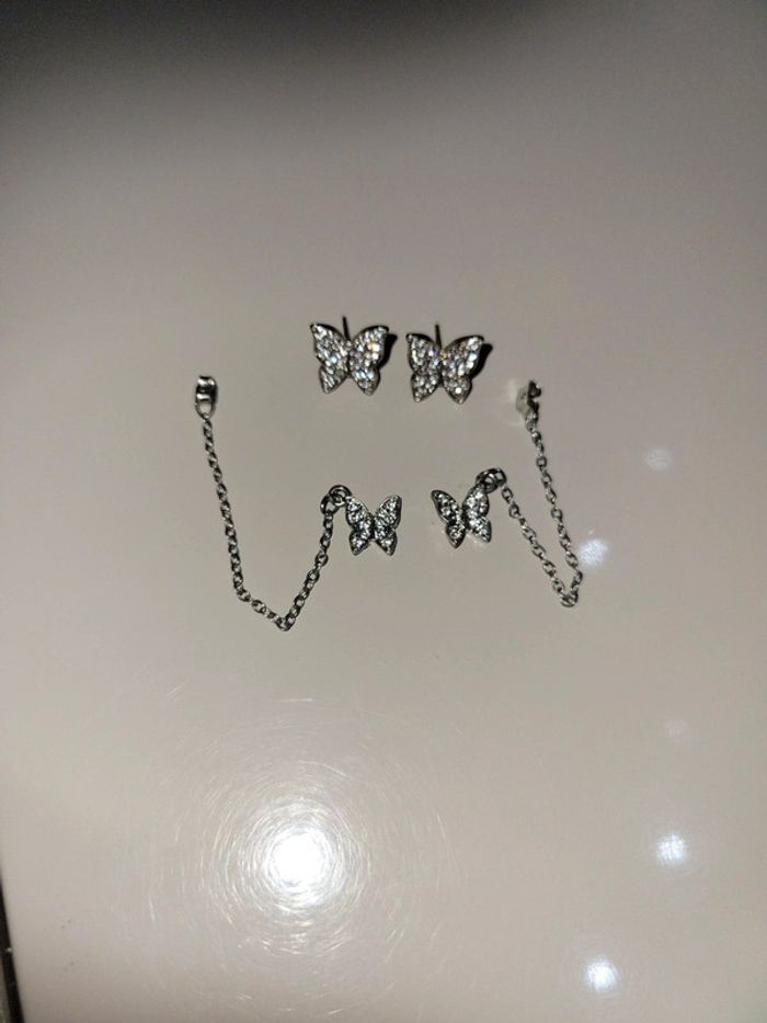 2 clous d'oreilles papillons à strass fermés par fermoirs rehaussés d'une chaînette terminée par un papillon à strass plus petit