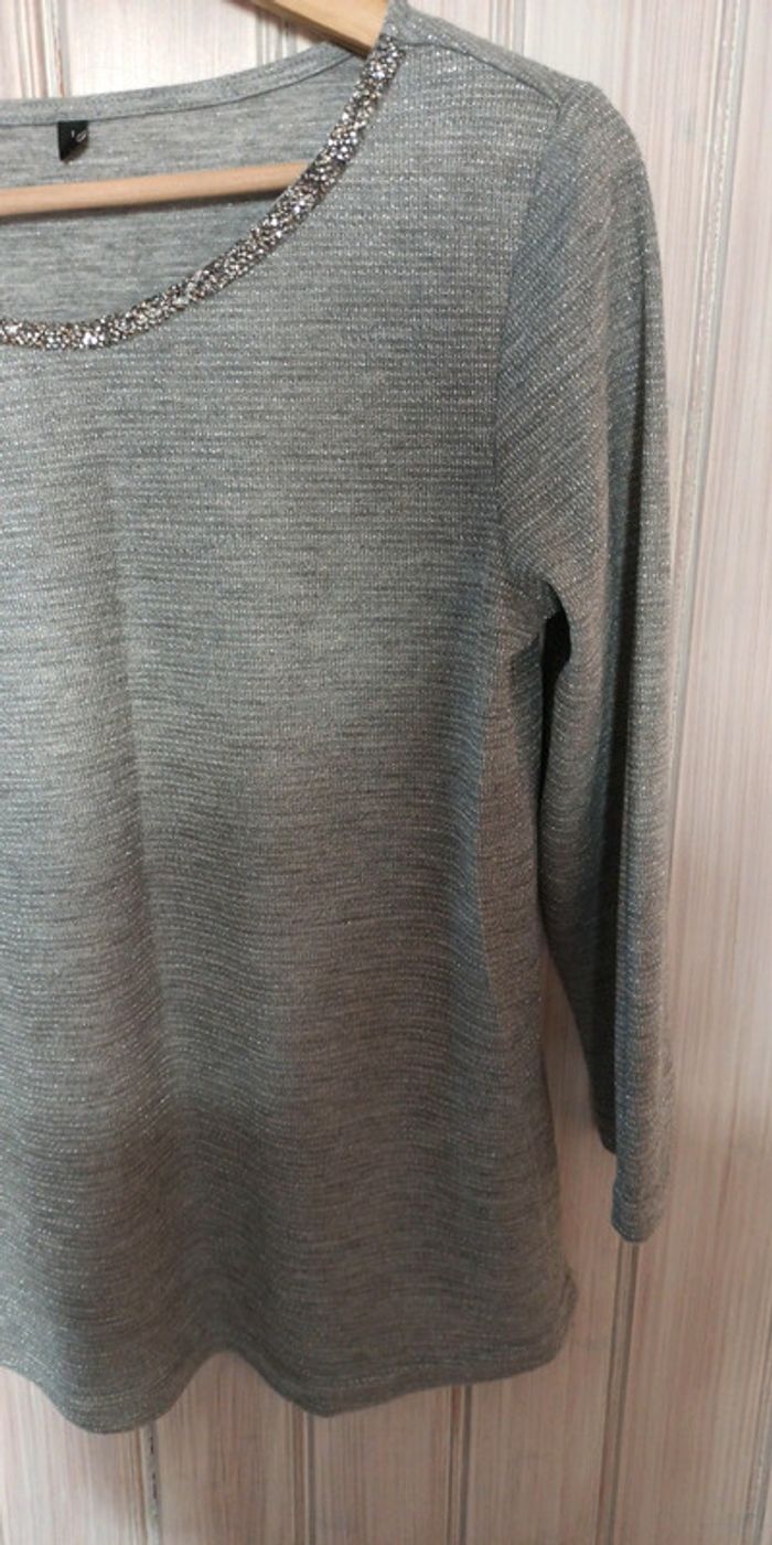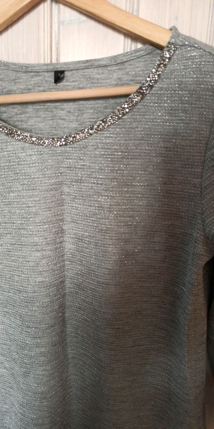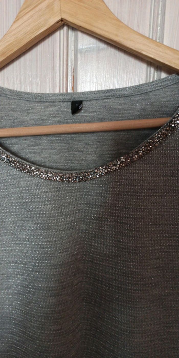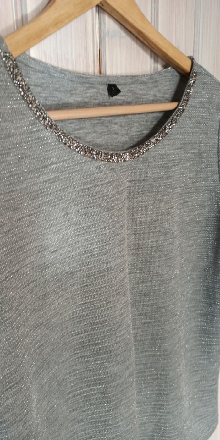 Haut manches 3/4 Gris avec fils brillant Taille 1 Col avec brillants