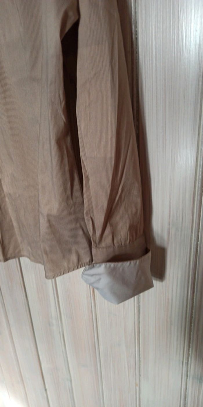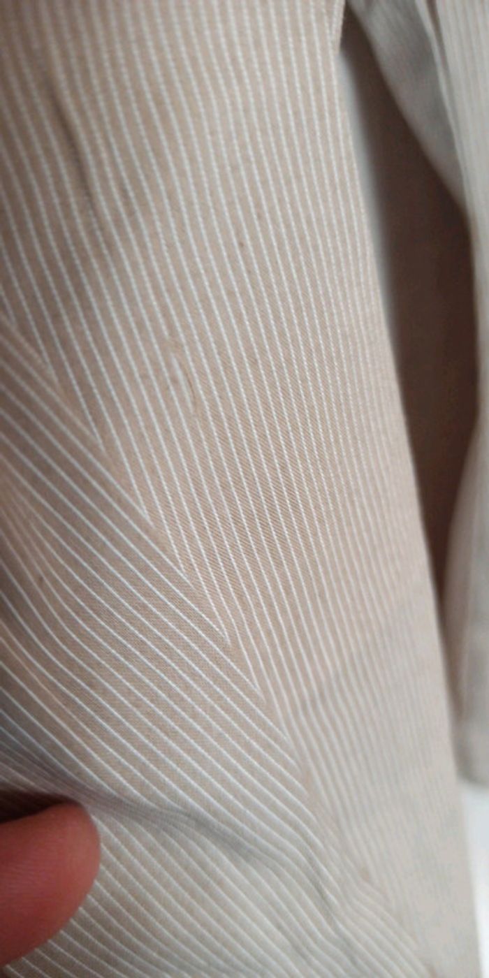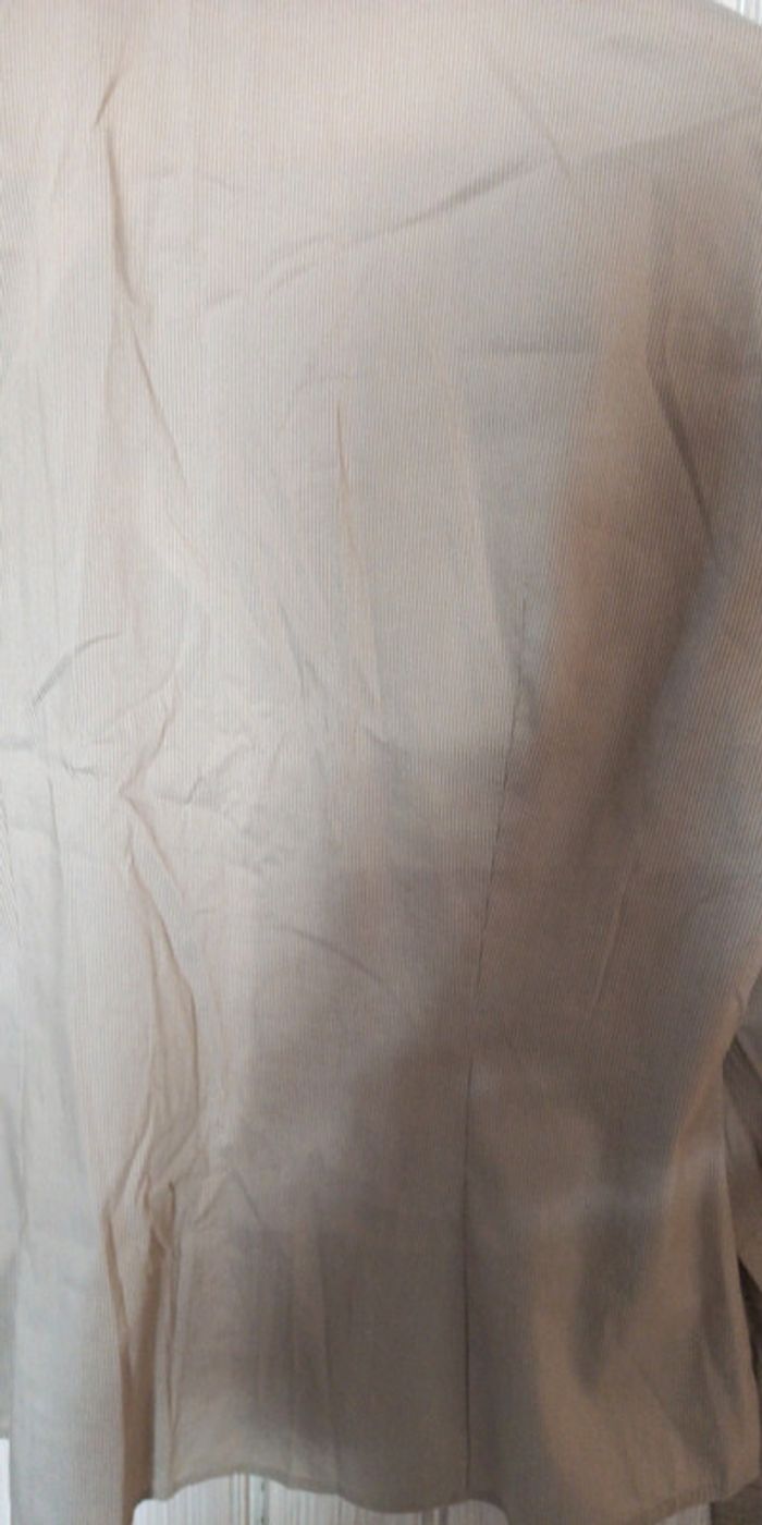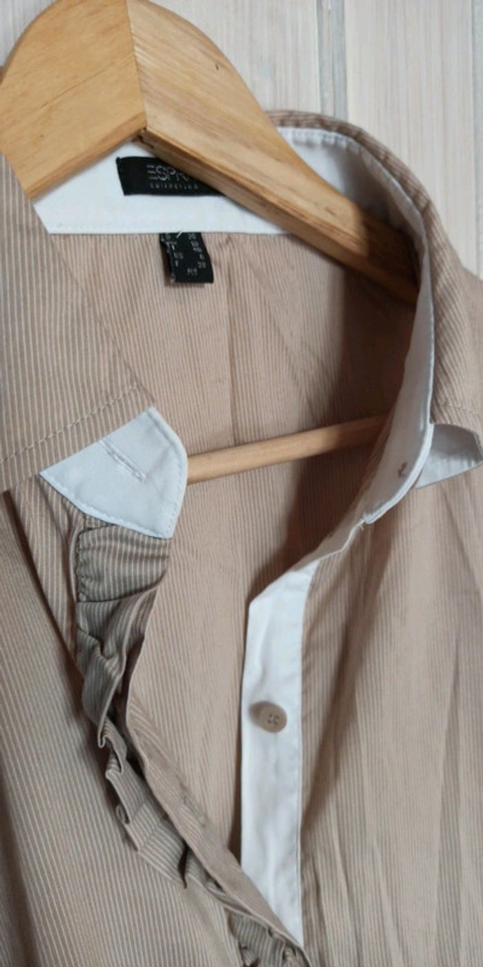 Chemise Esprit collection Très chic avec ses détails : revers de manches, poitrine Beige rayée blanche Taille 38 Petit défaut mais réparé : voir photo numéro 5. Tissu au niveau de la Manche.