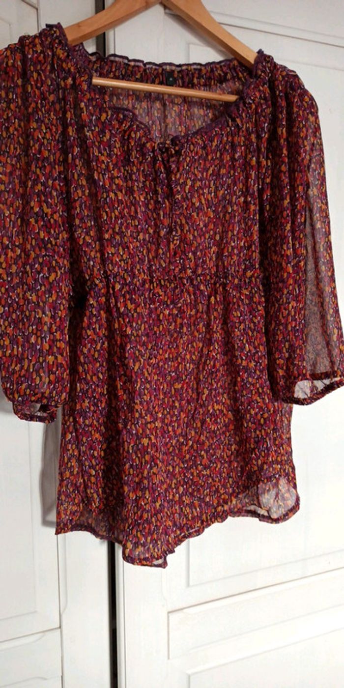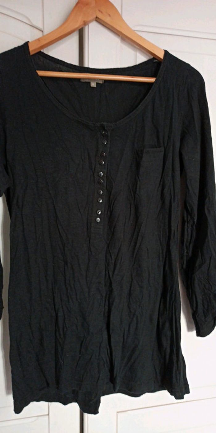 Lot : - Haut imprimé taille 44 - t-shirt noir manches 3/4 - haut noir satiné avec nœud à nouer au col Tout en 44