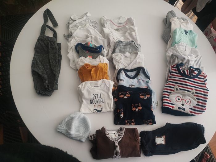 6 pyjamas ( sergent major, tex, Primark, Kiabi ...) 16 bodies ( C & A, Gémo, petit bateau, tex ...) 1 pantalon 1 gilet 1 bonnet 1 salopette