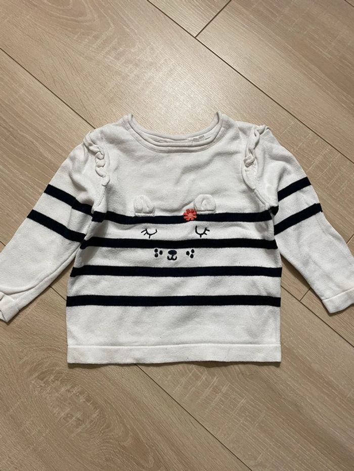 Lot pull gilet Orchestra fille 1 pull blanc rayé marine 1 gilet marine avec cœur blanc. Intérieur fourre chaud (la manche semble avoir une tache mais je pense que ça part au lavage) Très bon état 12 mois
