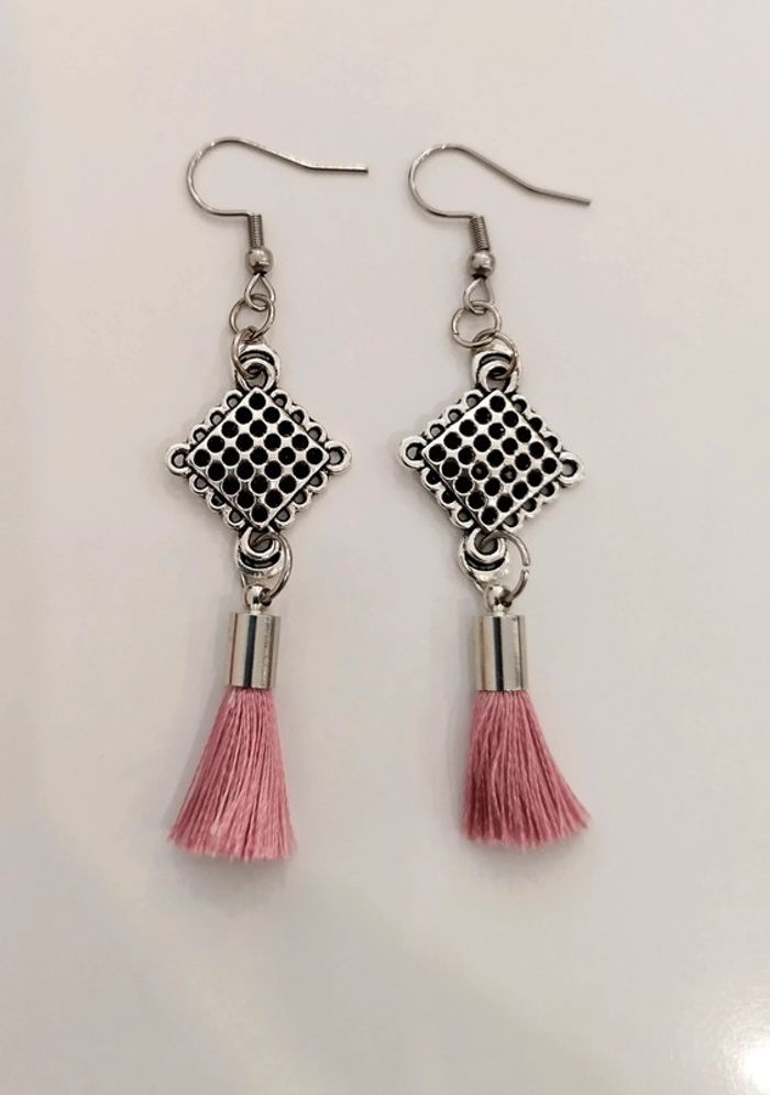 Jolies boucles d'oreilles avec pompons de couleur vieux rose #bijouxbabane