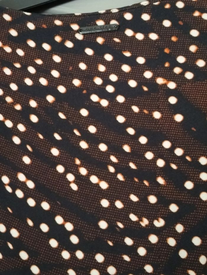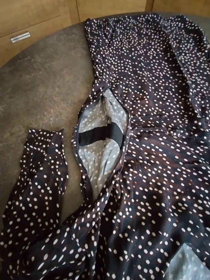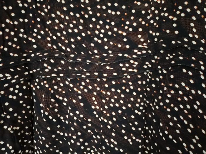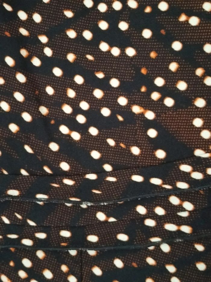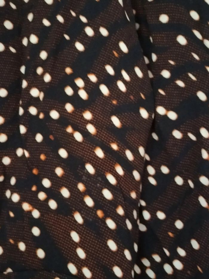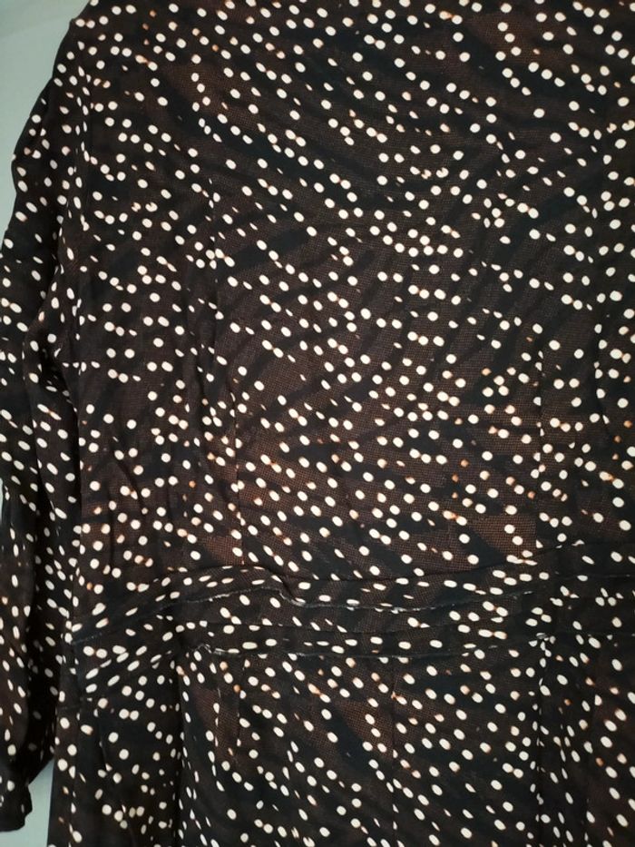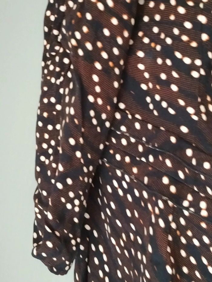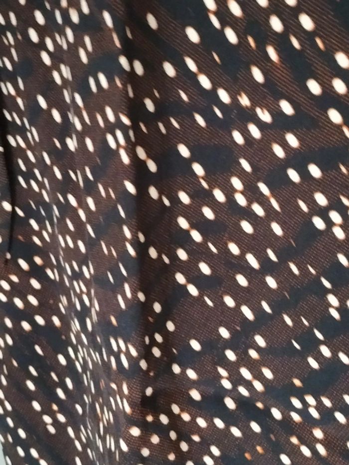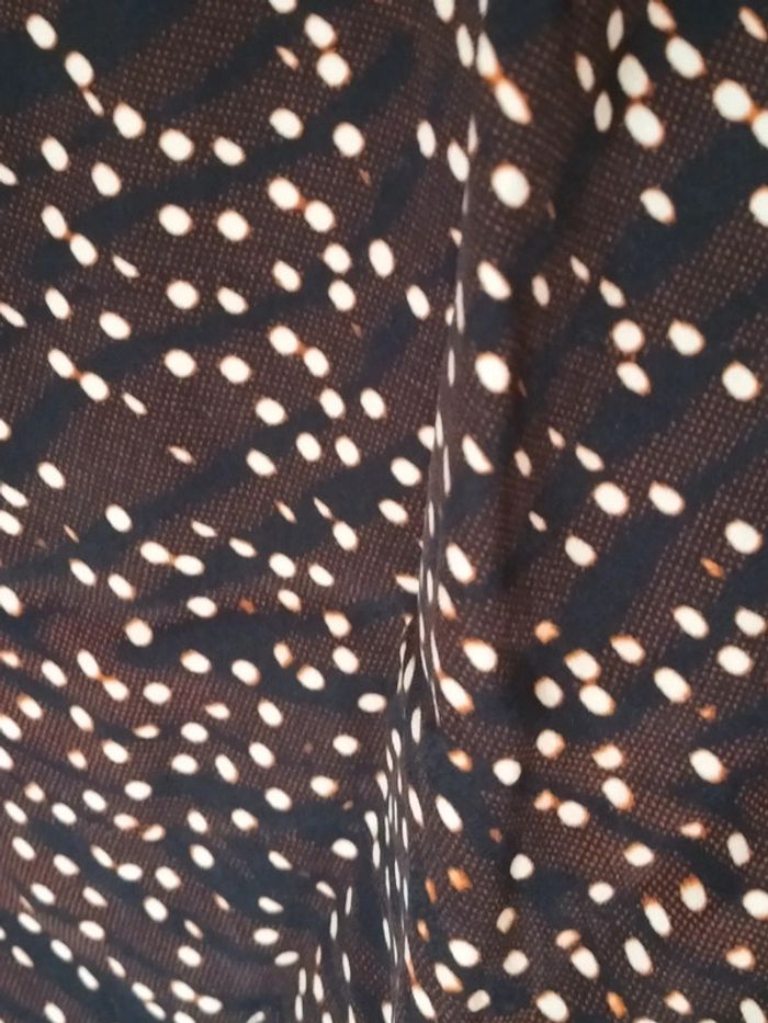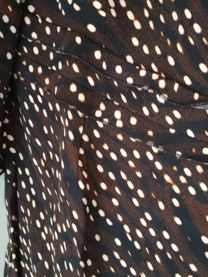 Robe marron / noir / blanc motifs ronds . Manches 3/4. Col V, Fermeture éclair sur le côté Longueur aisselles à aisselles 47 cm Largeur taille 42 cm. Longueur totale 98 cm. En très bon état.