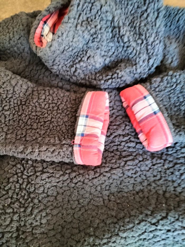 bon état, gilet zippé gris anthracite et écossais rouge de nuit, pratique à enfilé et à enlevé sur les pyjamas, en défaut, sous les coudes la matière est un peu tassée, voir sur les photos