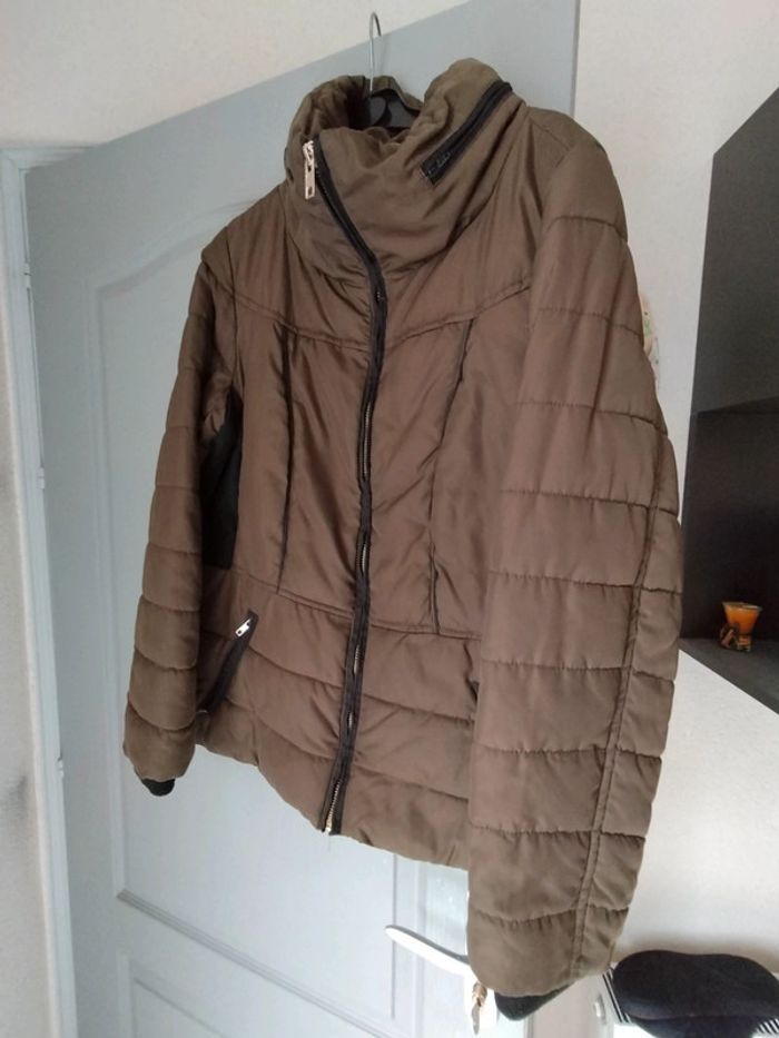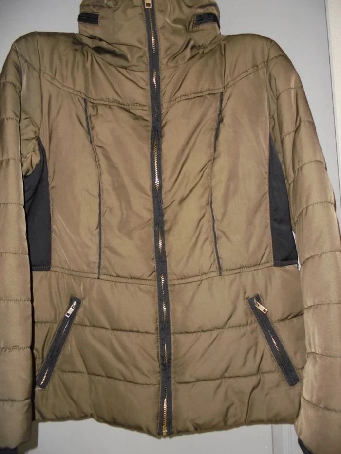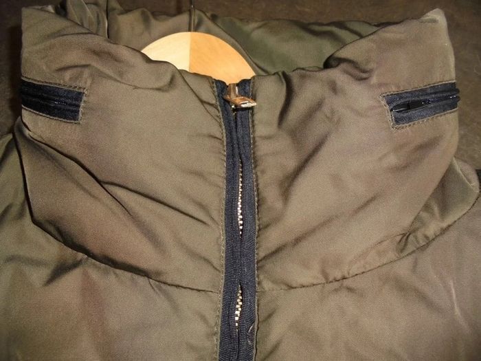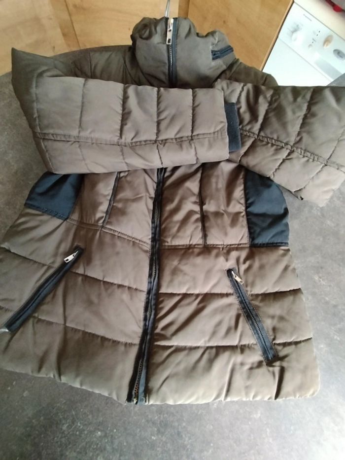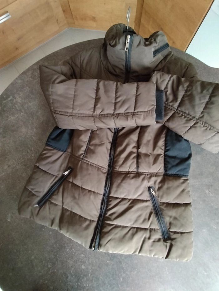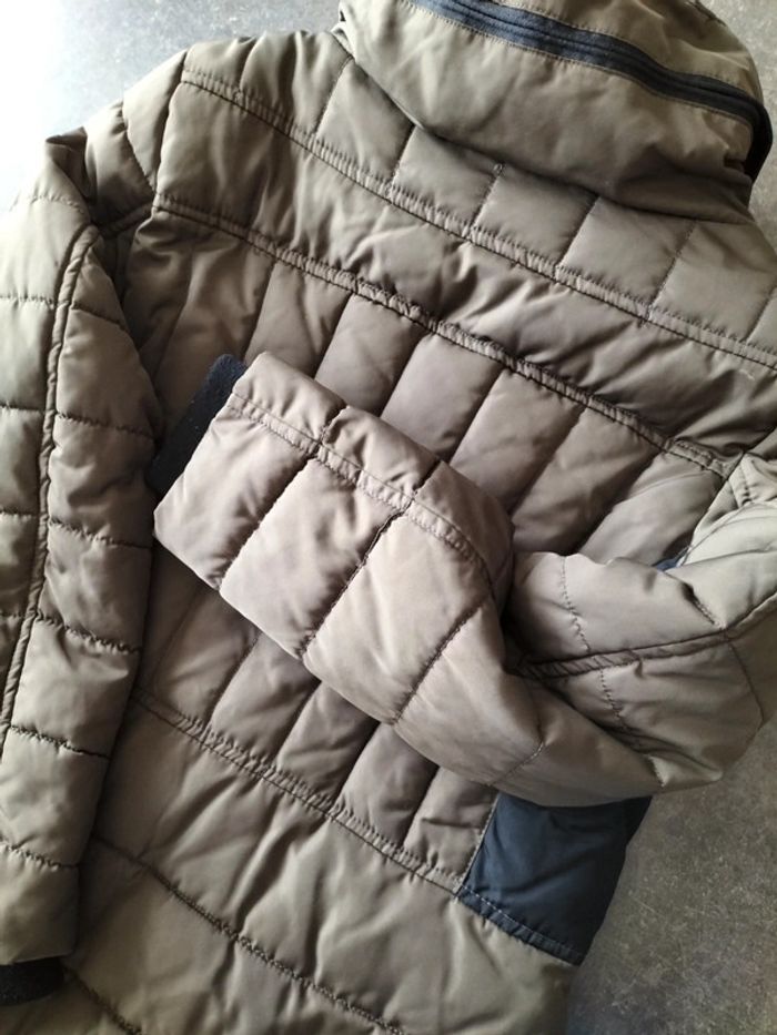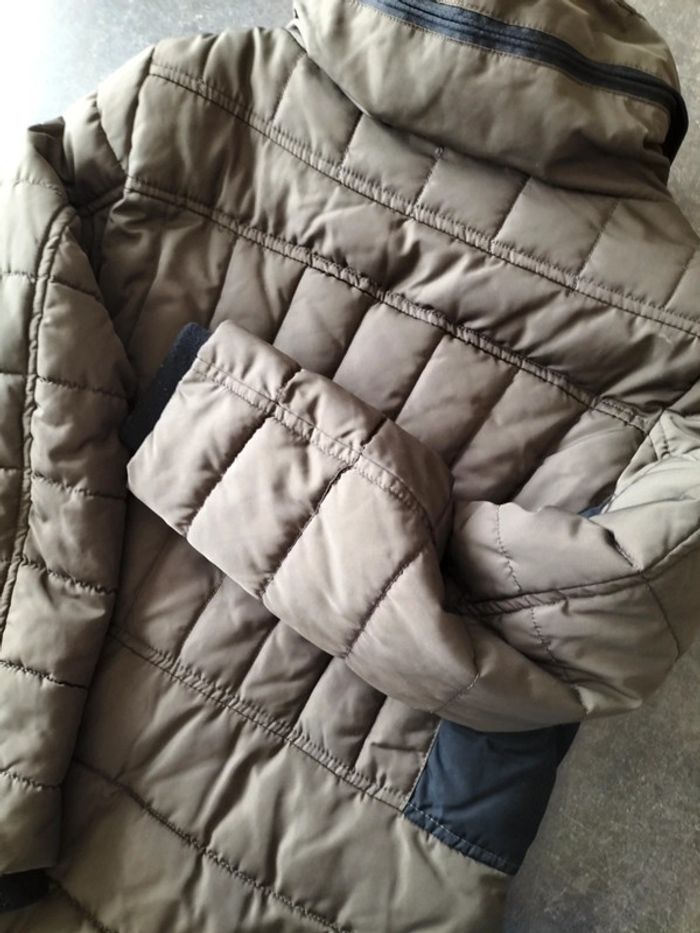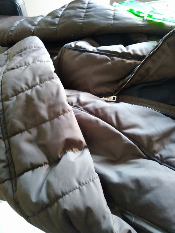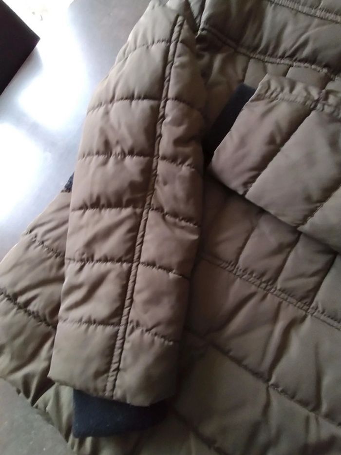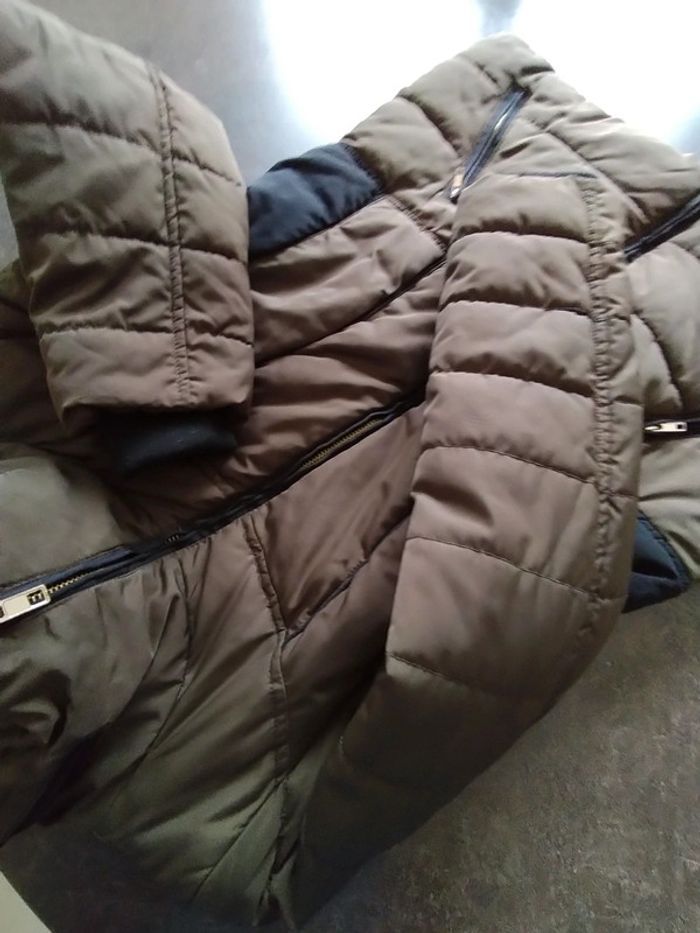 Très bon état, peu porté, blouson taupe et noir en 46, capuche intégrée dans le col. Dimensions aisselles à aisselles 56cm. Prix ferme, merci de votre compréhension.