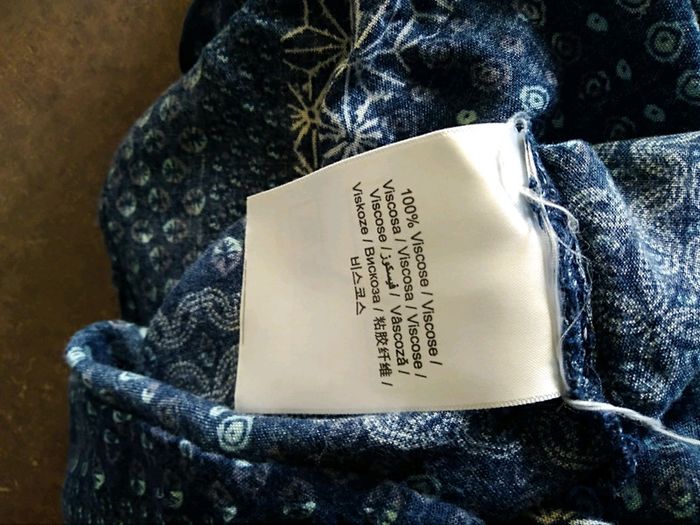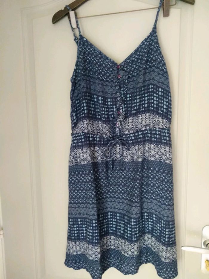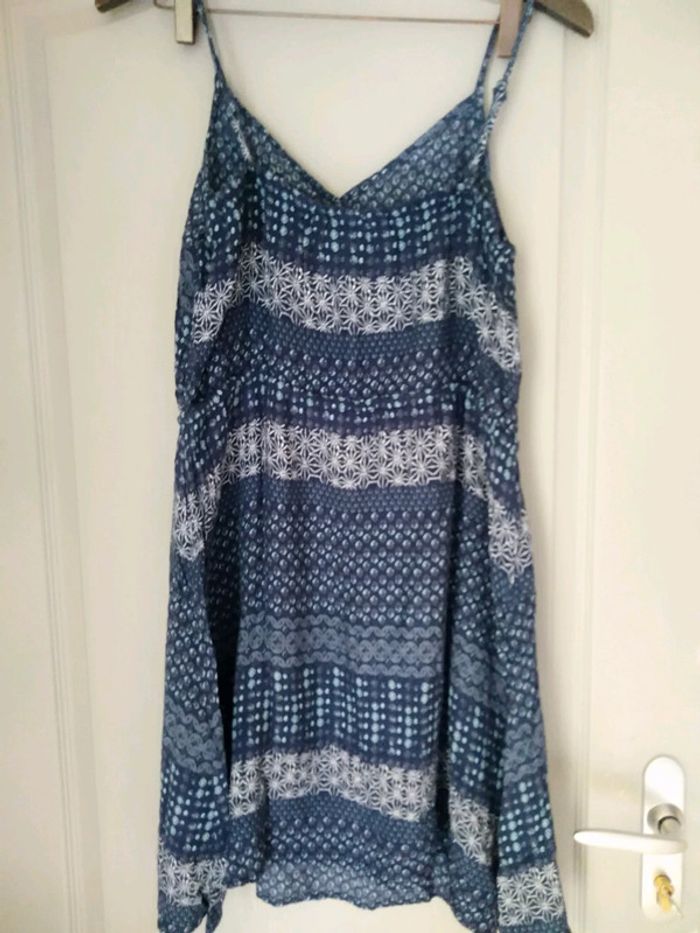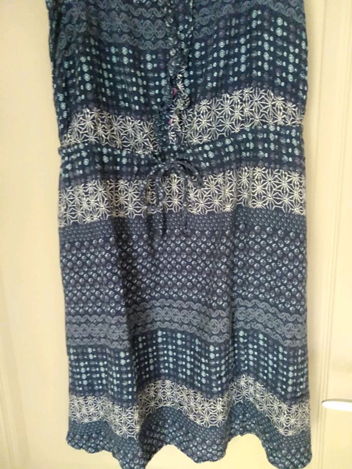 État satisfaisant, robe au niveau du genou, 100%viscose, en défaut elle à un accro en bas d'un côté voir les 2 dernières photos, lien élastiqué à la taille.