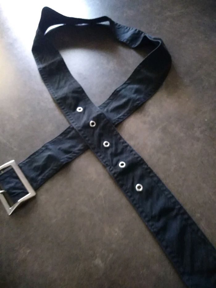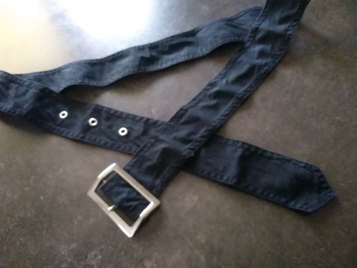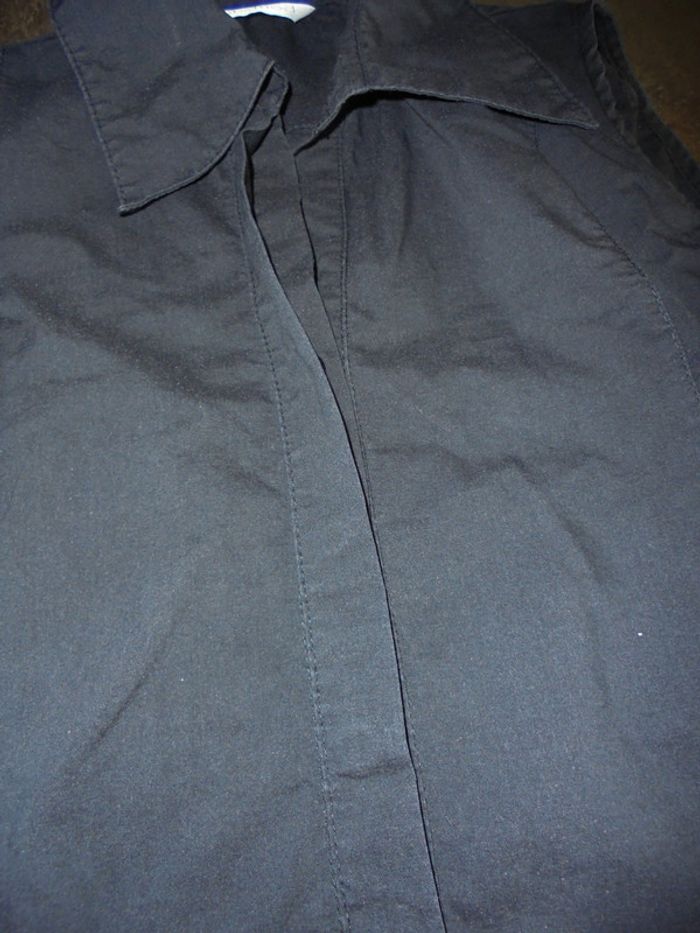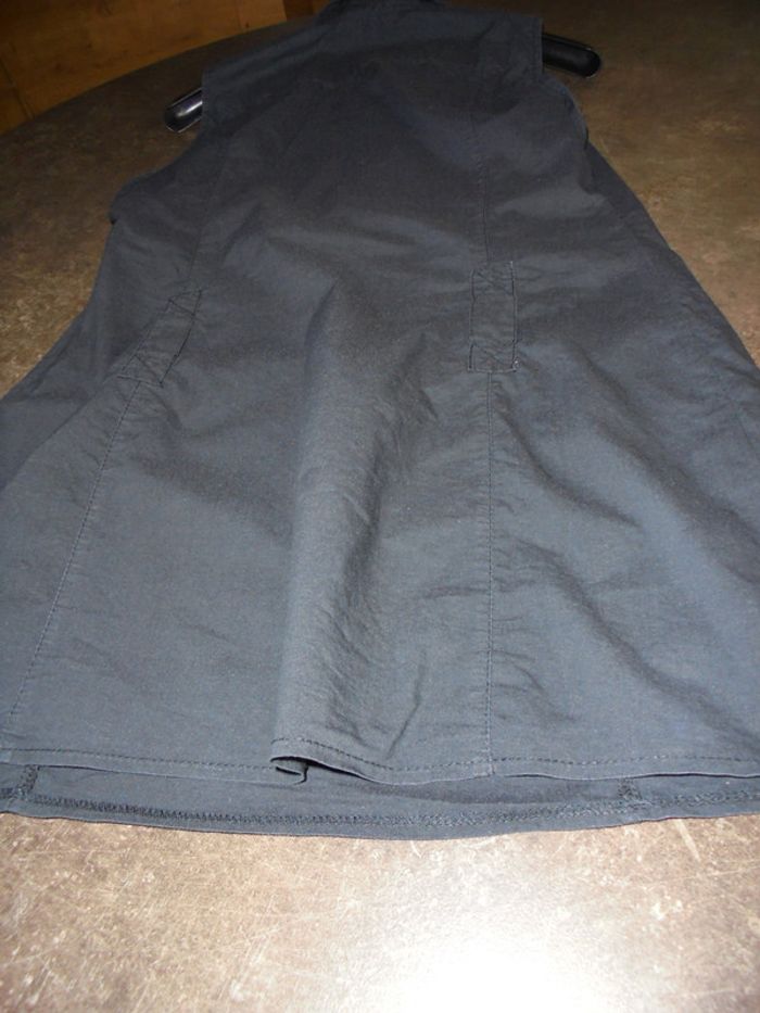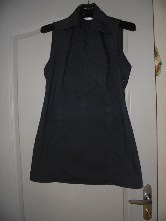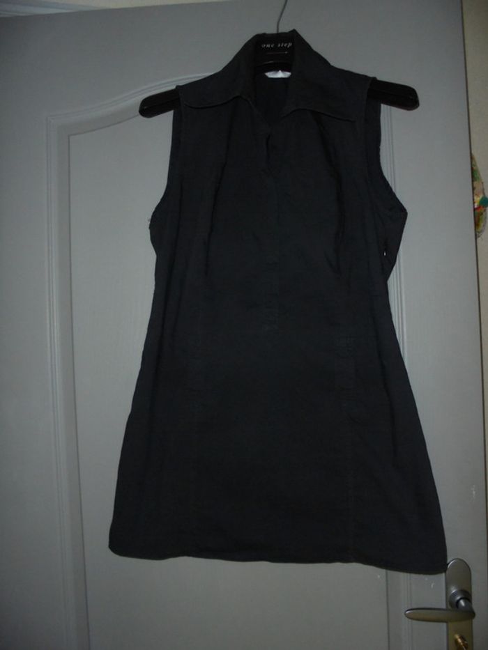 Bon état, tunique noire sans manche 44, fermeture glissière fentes sur les côtés, passants pour ceinture qui est incluse, couleur un peu estompée