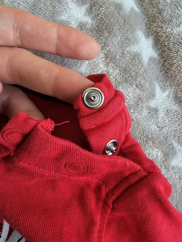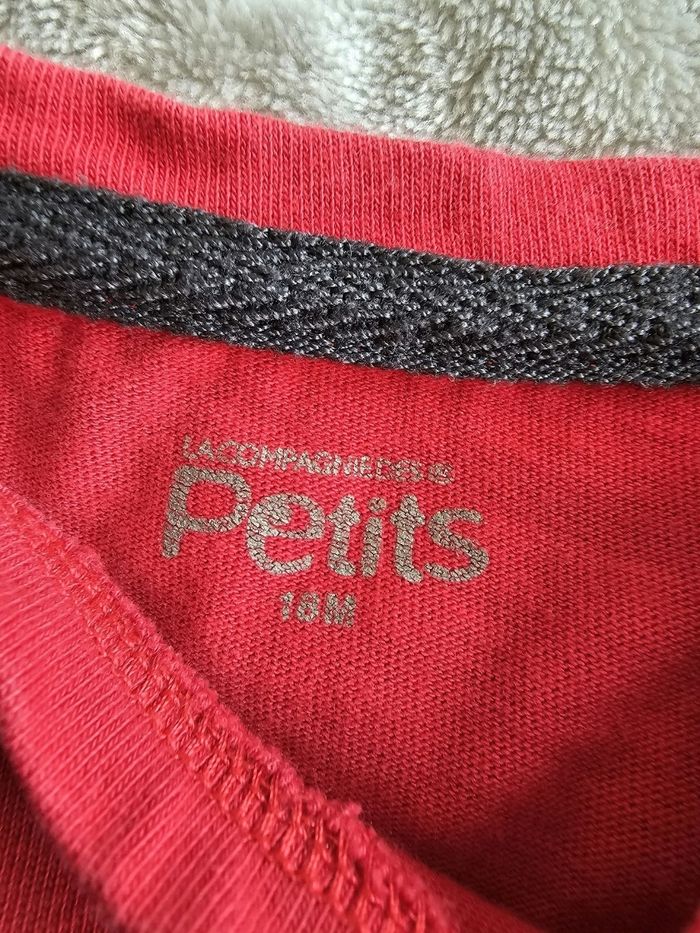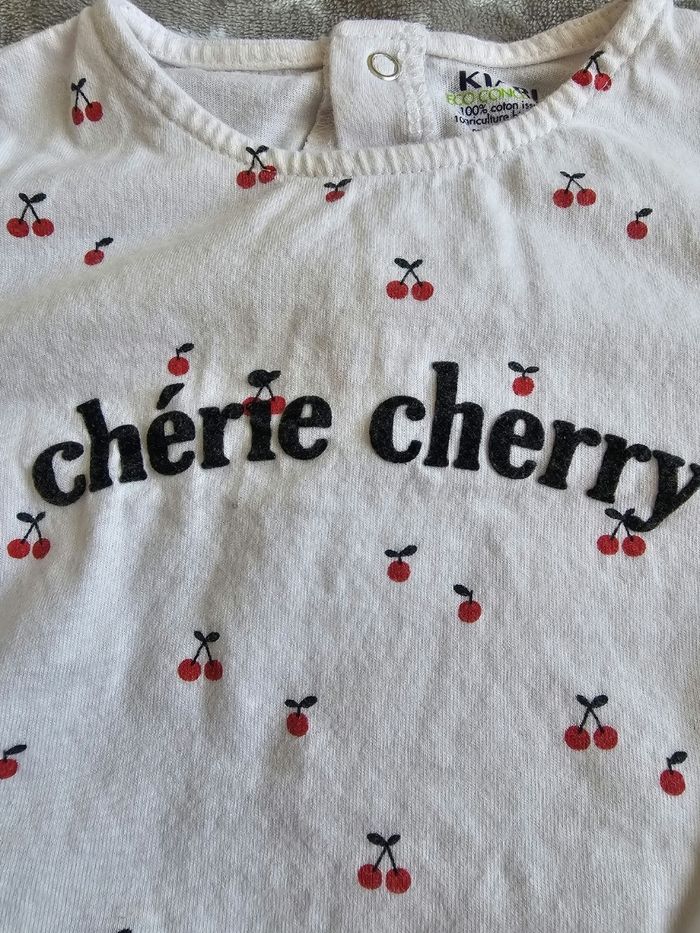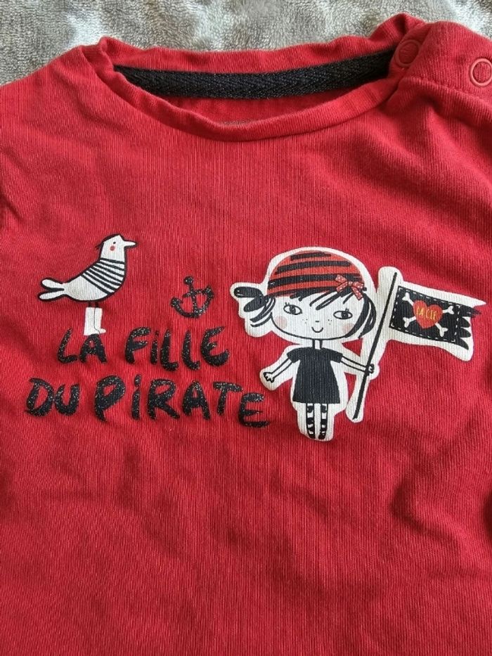 Lot de deux t-shirts fille à manches longues. Un rouge avec inscriptions "La fille du pirate" à paillettes sur le devant. Ouverture à l'épaule par deux pressions. Marque La Compagnie des Petits. Porté une ou deux fois, il est en très bon état. Un blanc imprimé cerises avec inscription "Chérie cherry" en feutrine sur le devant. Ouverture dans le dos par trois pressions. Marque Kiabi. Souvent porté, il est en bon état, le blanc à perdu son éclat. Taille 18 mois.