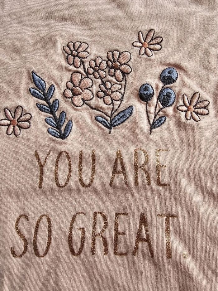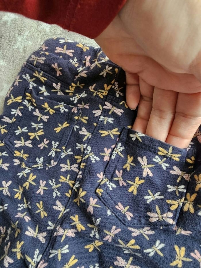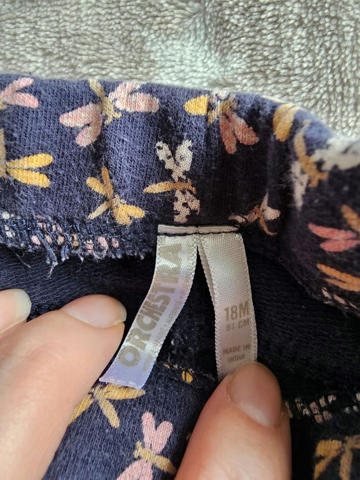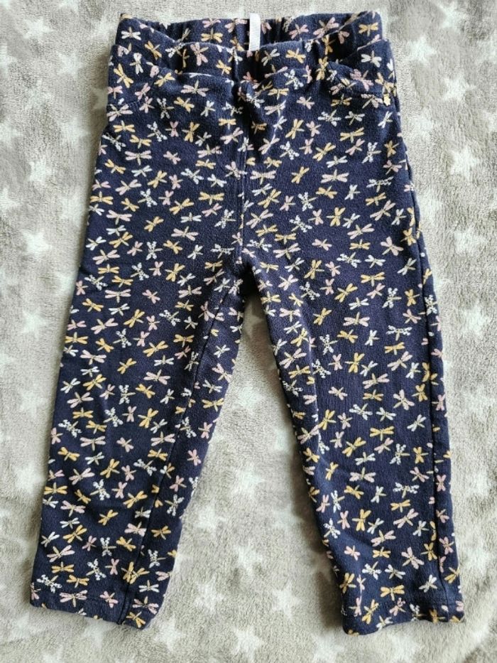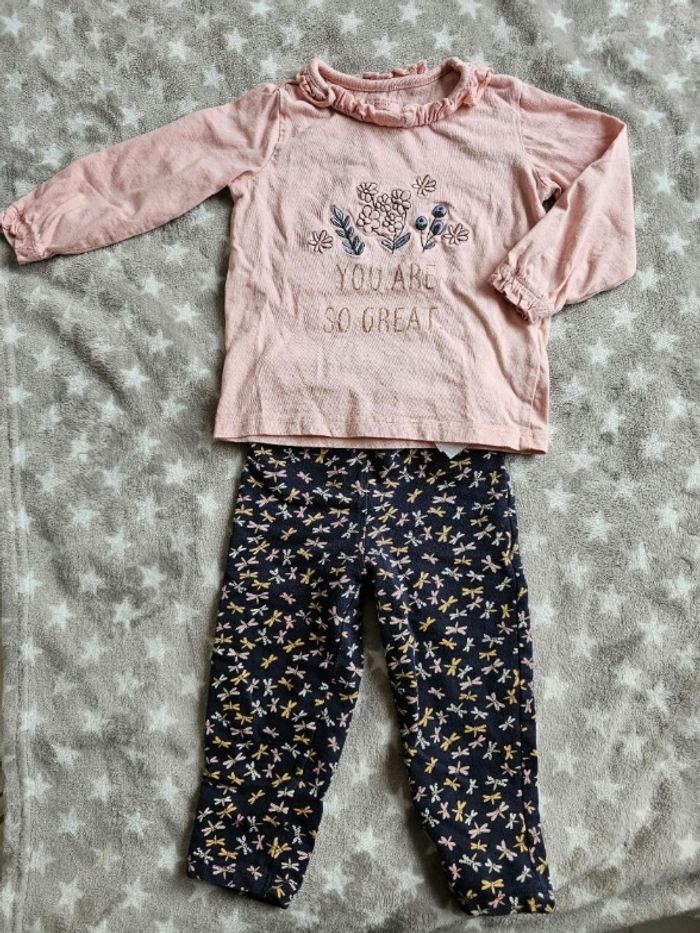 Ensemble fille mi-saison. T-shirt rose pâle avec fleurs brodées et inscriptions dorées à paillettes sur le devant. Manches resserrées aux poignets et collerette. Taille 12-18 mois, marque Primark. Legging bleu marine imprimé motifs libellules, avec deux vraies poches plaquées à l'arrière et ceinture élastique. Taille 18 mois, marque Orchestra. Porté plusieurs fois, il est en très bon état.