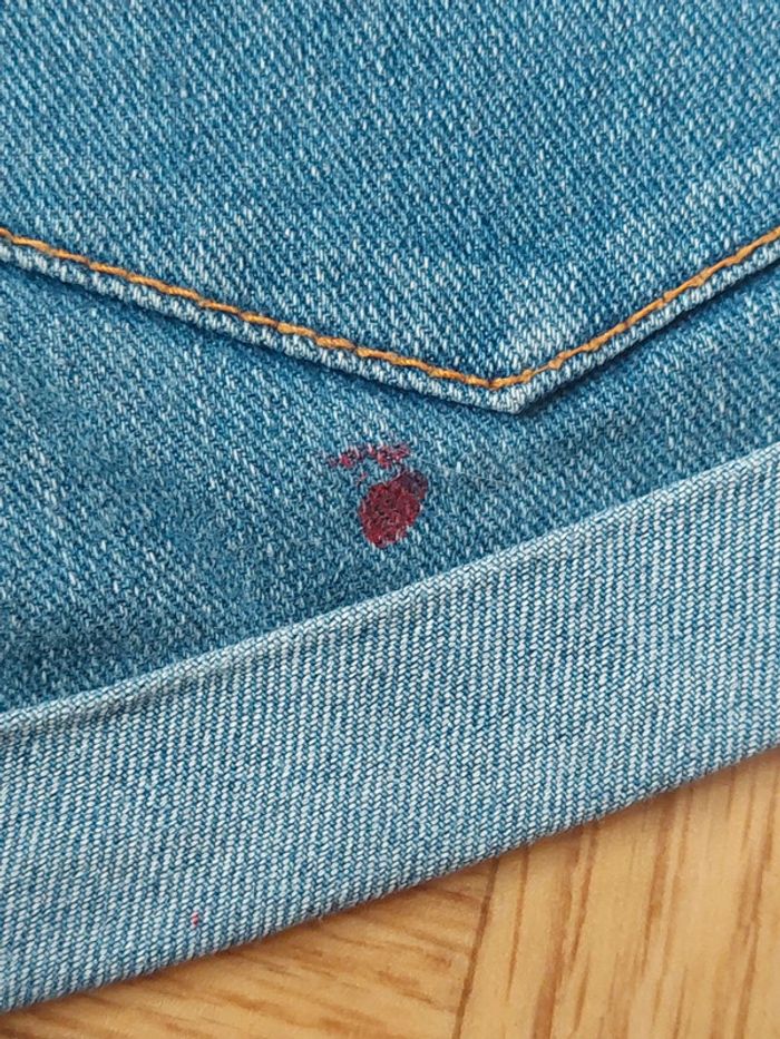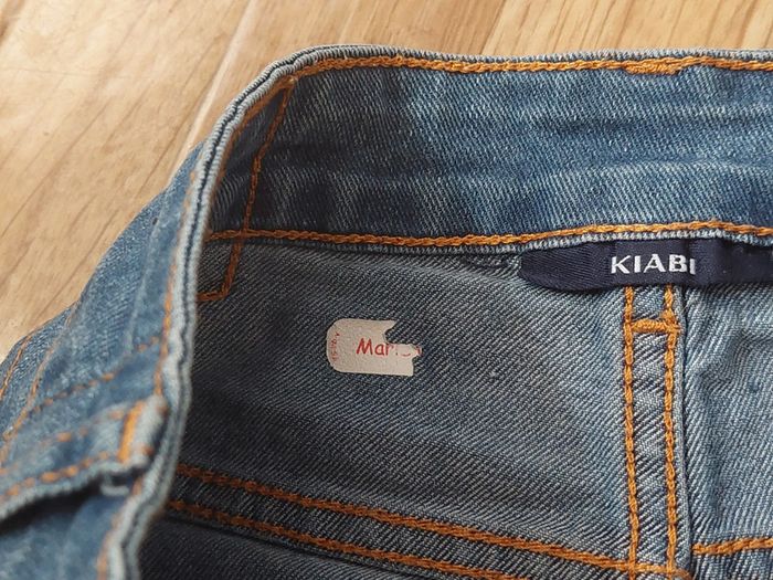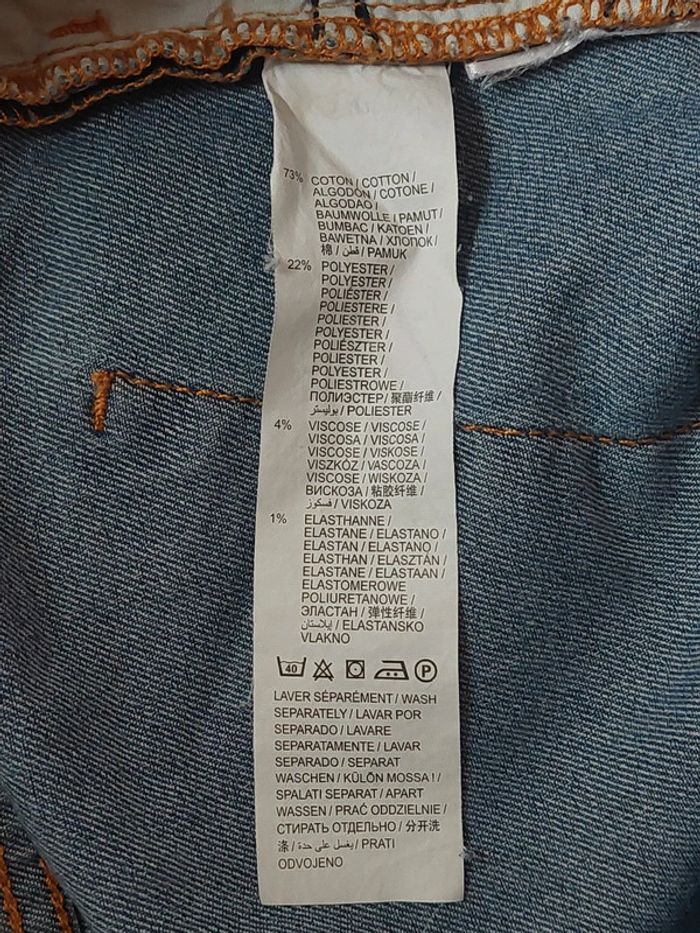 Short en jean, 38 : - fermeture par bouton + fermeture éclair - 2 poches + 1 petite poche à l'avant - 2 poches à l'arrière - 73% coton, 22% polyester, 4% viscose, 1% élastane - il reste un morceau d'étiquette de prénom à l'intérieur du short (voir photo 6) - petite tâche de peinture sous la poche arrière droite du short (voir photo 7)