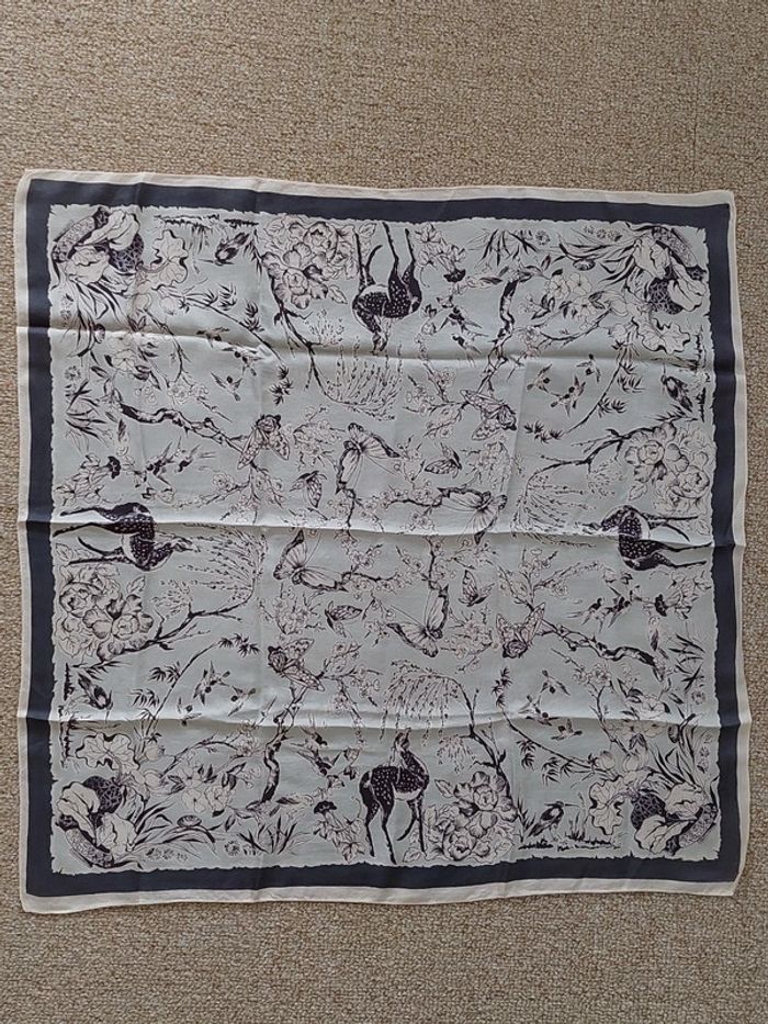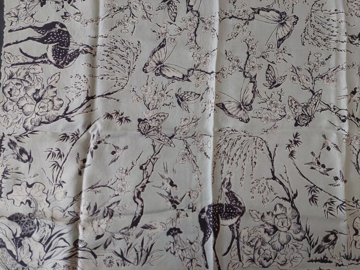 Foulard blanc/violet foncé aux motifs papillons, cerfs, oiseux, fleurs, 65cm de côté