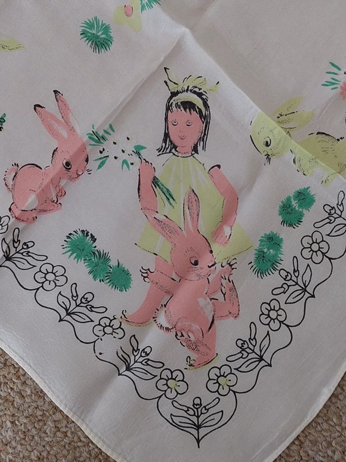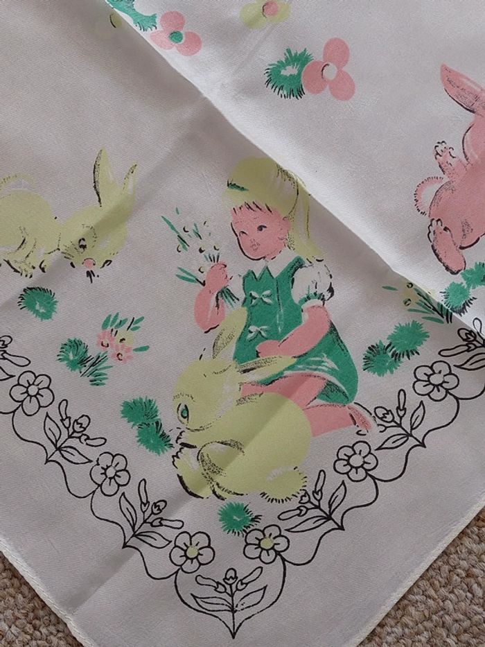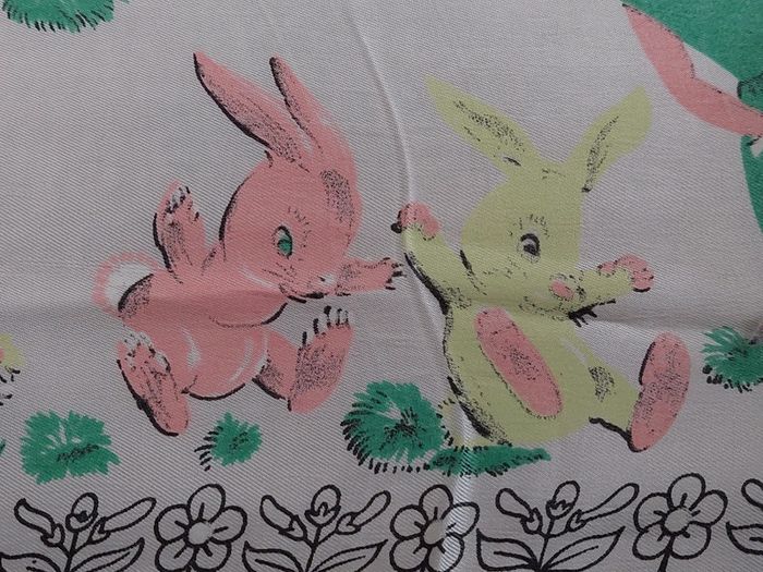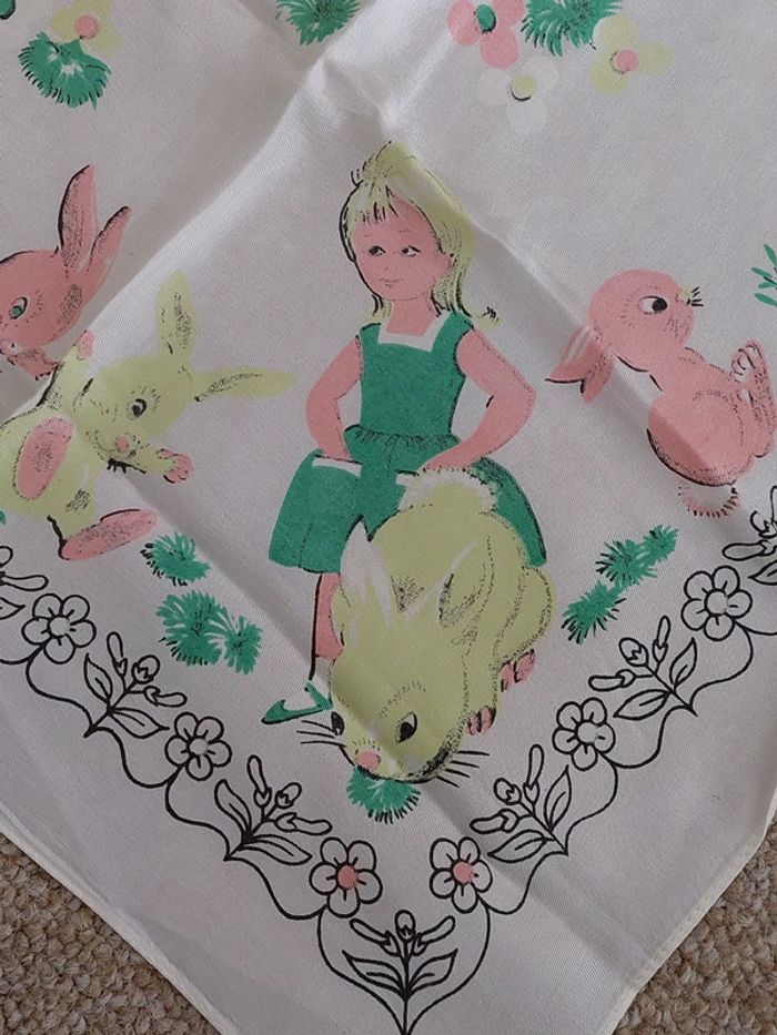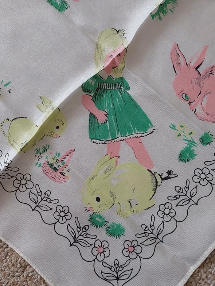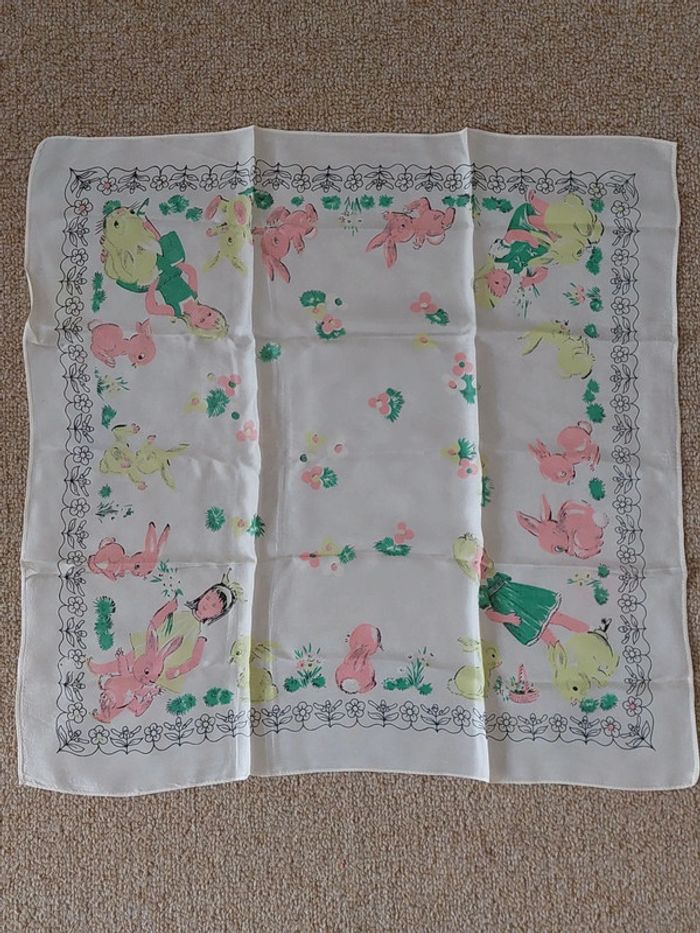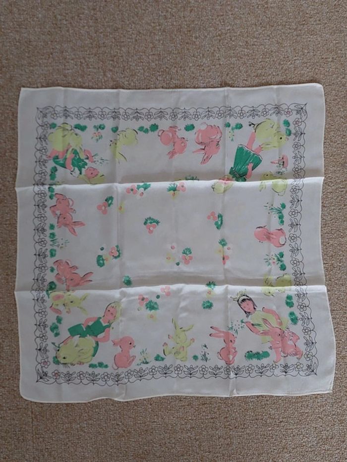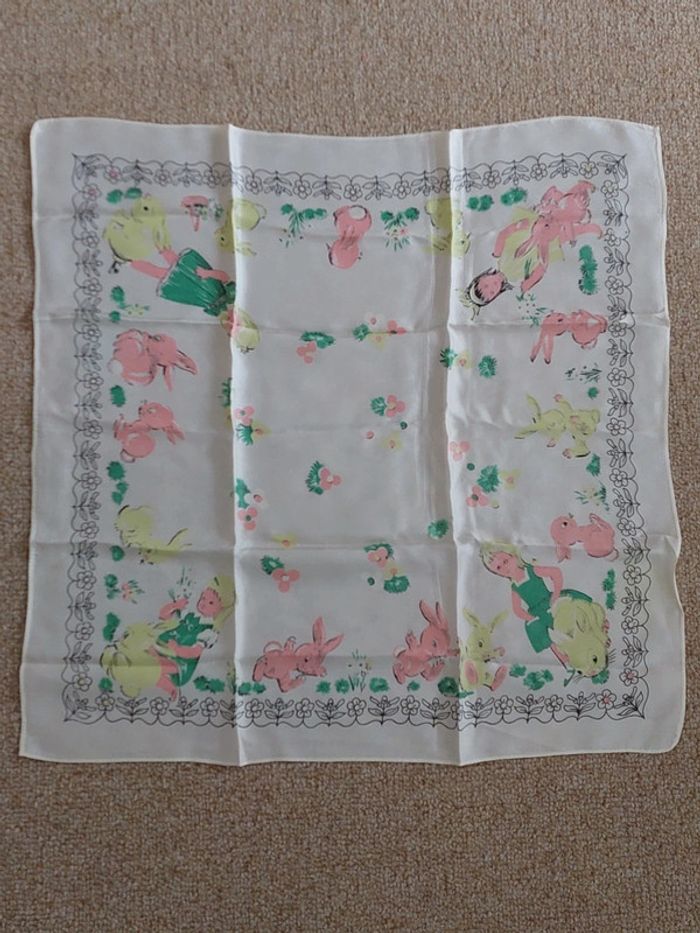 Foulard à motifs printaniers (lapins, fleurs, petites filles), 55cm de côté