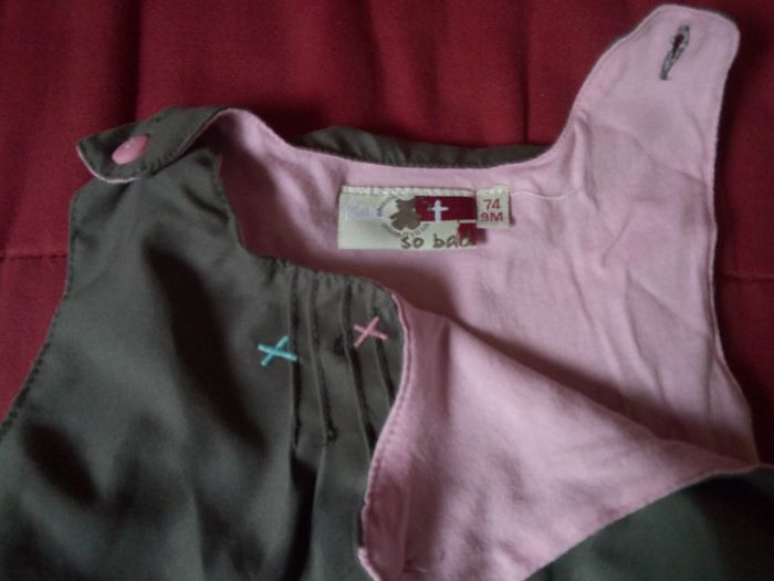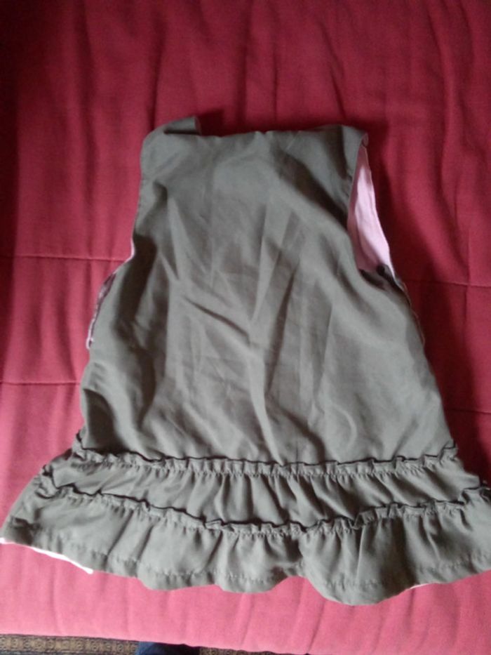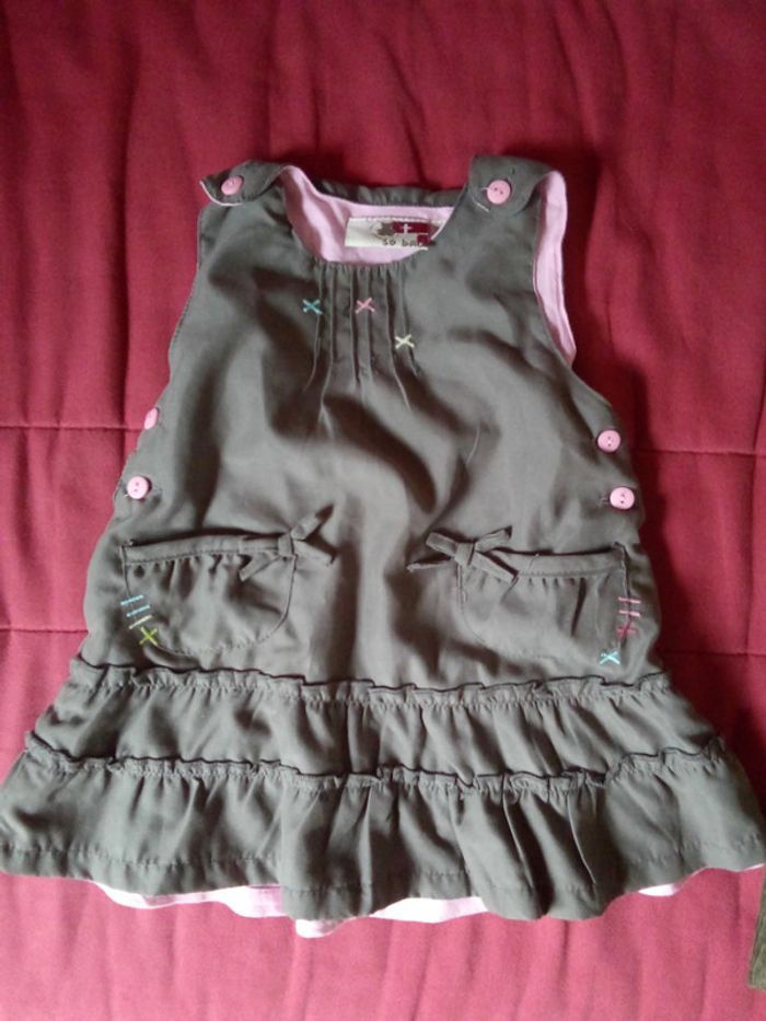Cette jolie robe grise et rose a été portée à plusieurs reprises. Elle se ferme avec des boutons roses classiques sur les côtés et sur les bretelles. Elle a de poches surmontées d'un petit noeud et de jolies coutures décoratives. Coton rose à l'intérieur et synthétique gris à l'extérieur.