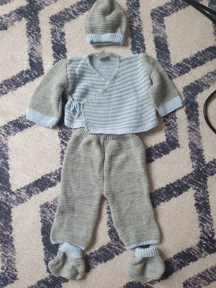 5 ensembles bebe garçons L'ensemble en laine est pour la naissance Les autres taille 3 mois Marques : obaibi et autres