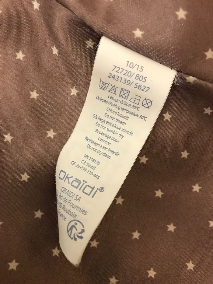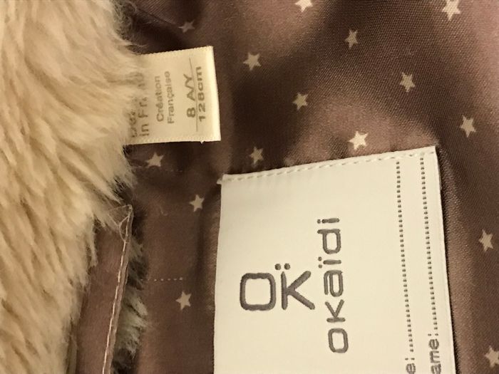 Encolure à col haut fermée par pression invisible. Forme courte. Fermé par fermeture éclair Pet être porté avec ou sans ceinture Couleur : beige clair Matière : Polyester: 25% et 75 % Acrylique Taille : 8 Ans Bon état Marque : OKAIDI