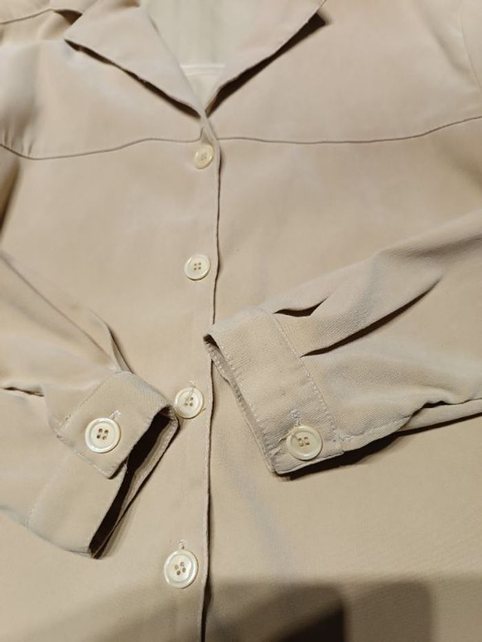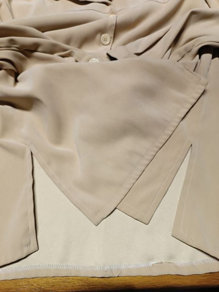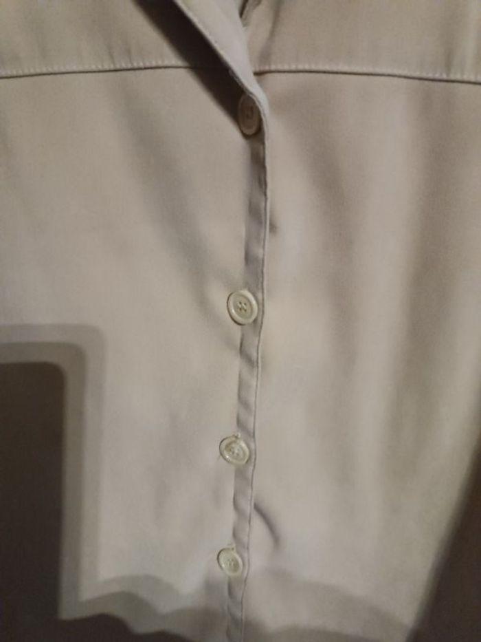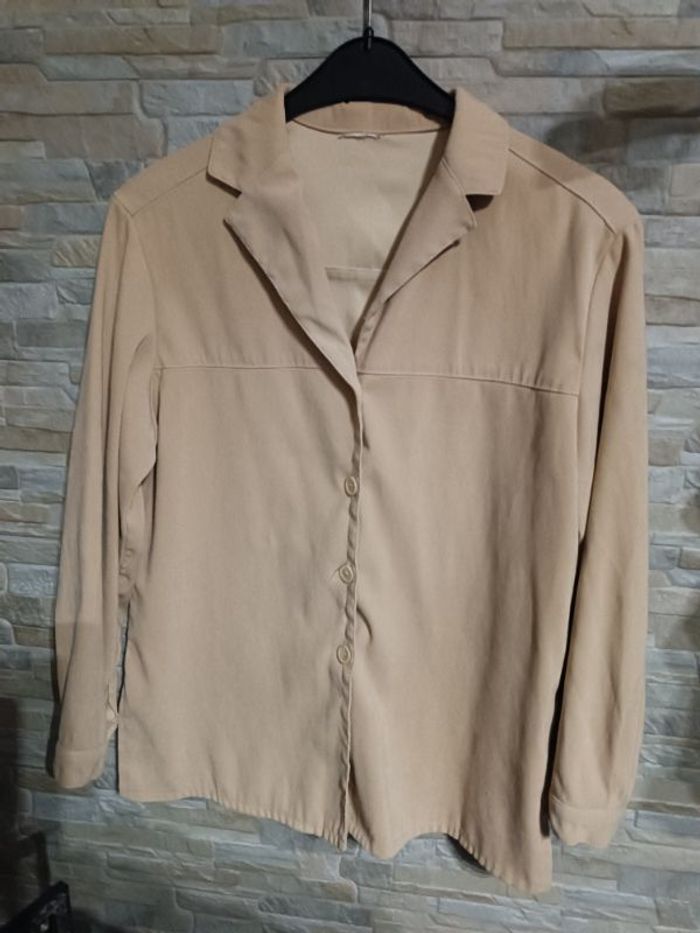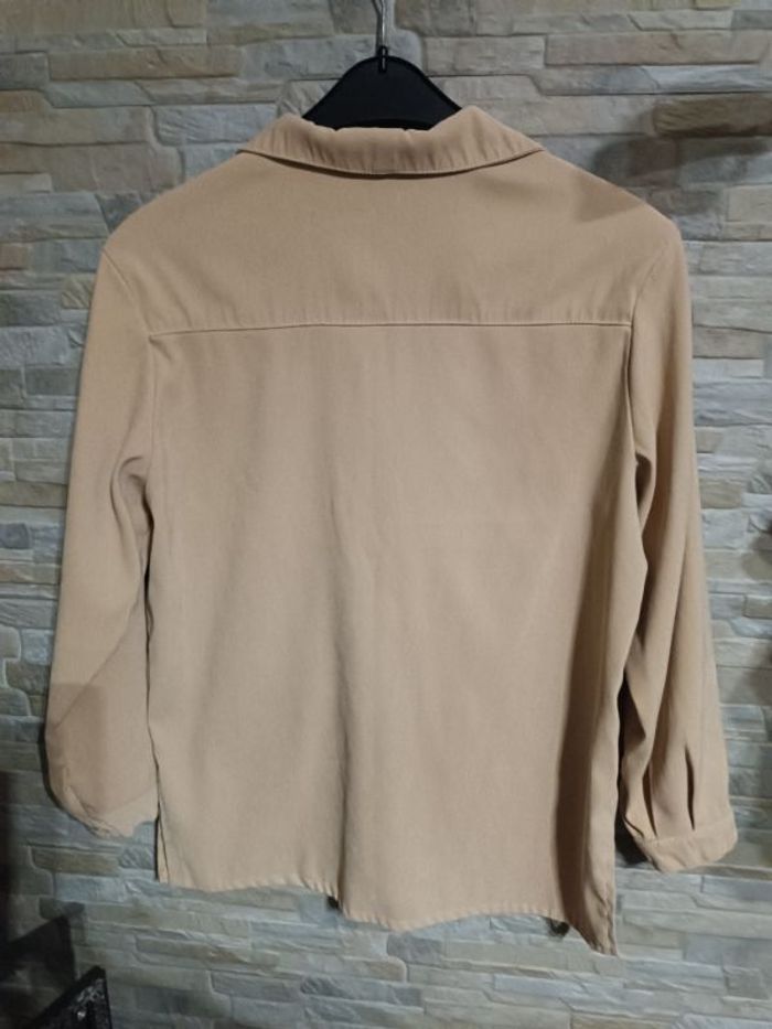 Surchemise beige sans marque, taille 44, longueur 72 cm, épaules 46 cm, aisselles 54 cm, fentes de chaque côté 14 cm, façon suédine 100% polyester - TBE