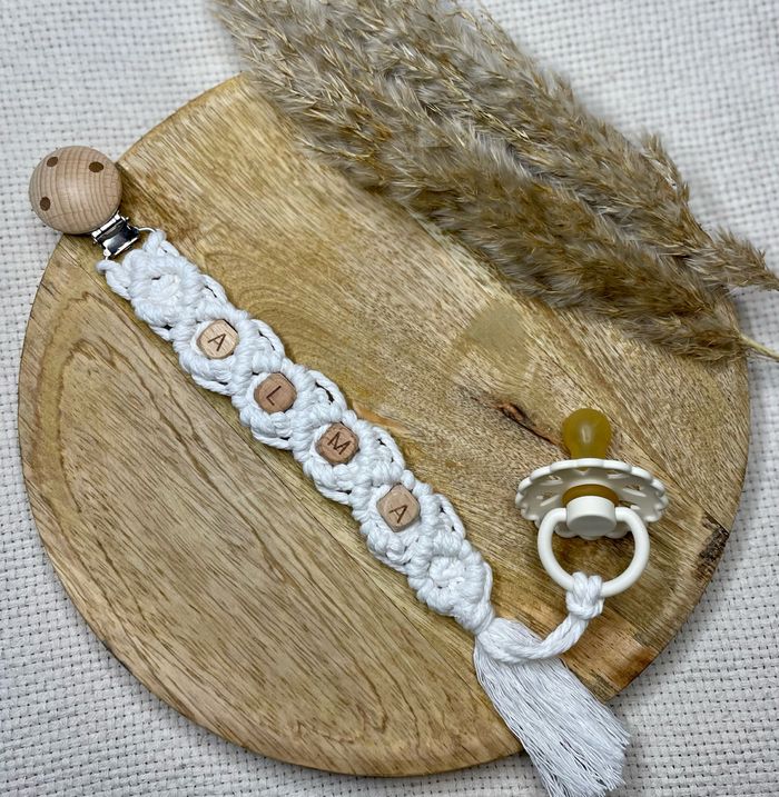 Attache tétine en macramé personnalisée selon le prénom de votre enfant (6 lettres maximum) N’hésitez pas à me contacter par mp avant tout achat🧡