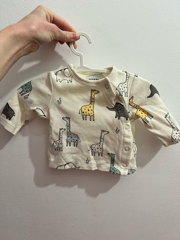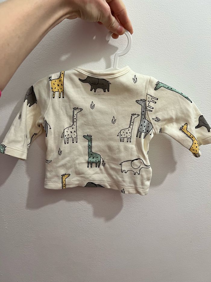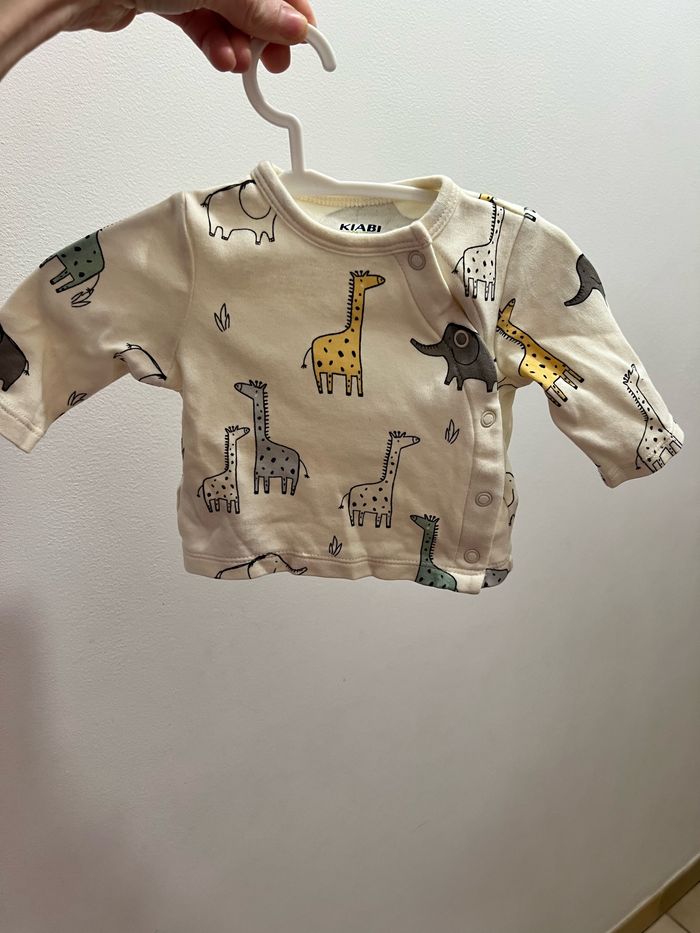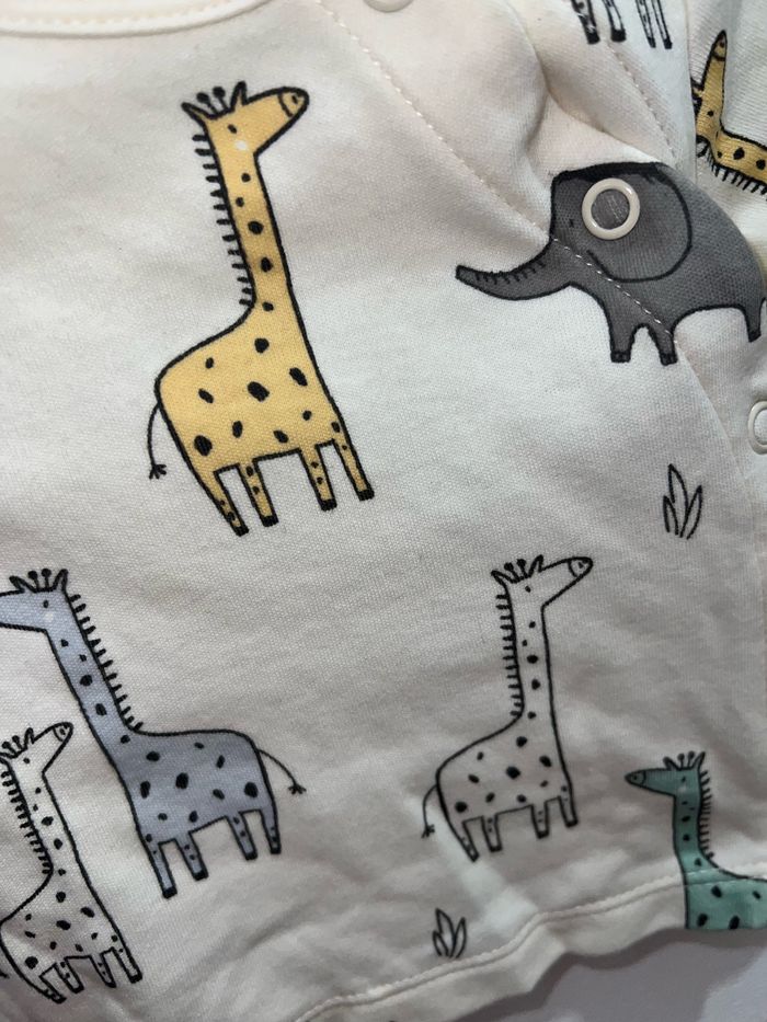 Ensemble pyjama naissance bébé mixte motifs animaux. Kiabi. Taille 0M 48-51 cm/ 3 kgs. Très bon état jamais porté par bébé juste lavé une seule fois en machine. Couleur beige et bleu. Absence d’étiquette à l’intérieur du pyjama (étiquette coupée). Le haut s’attache avec le bas voir photo 6.