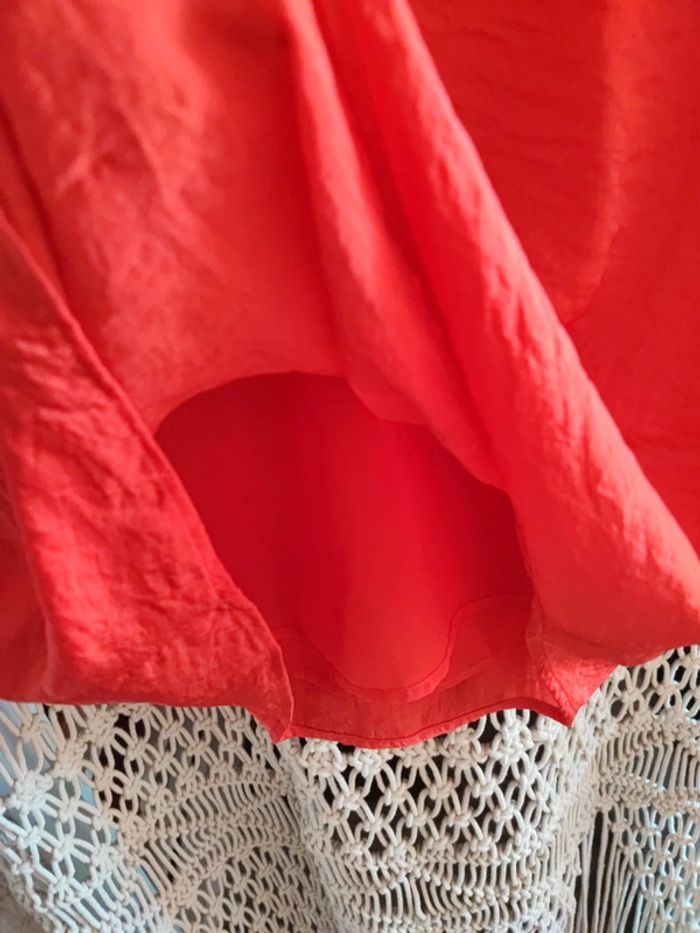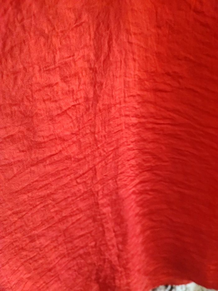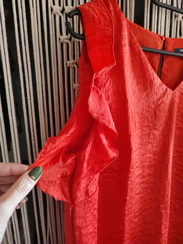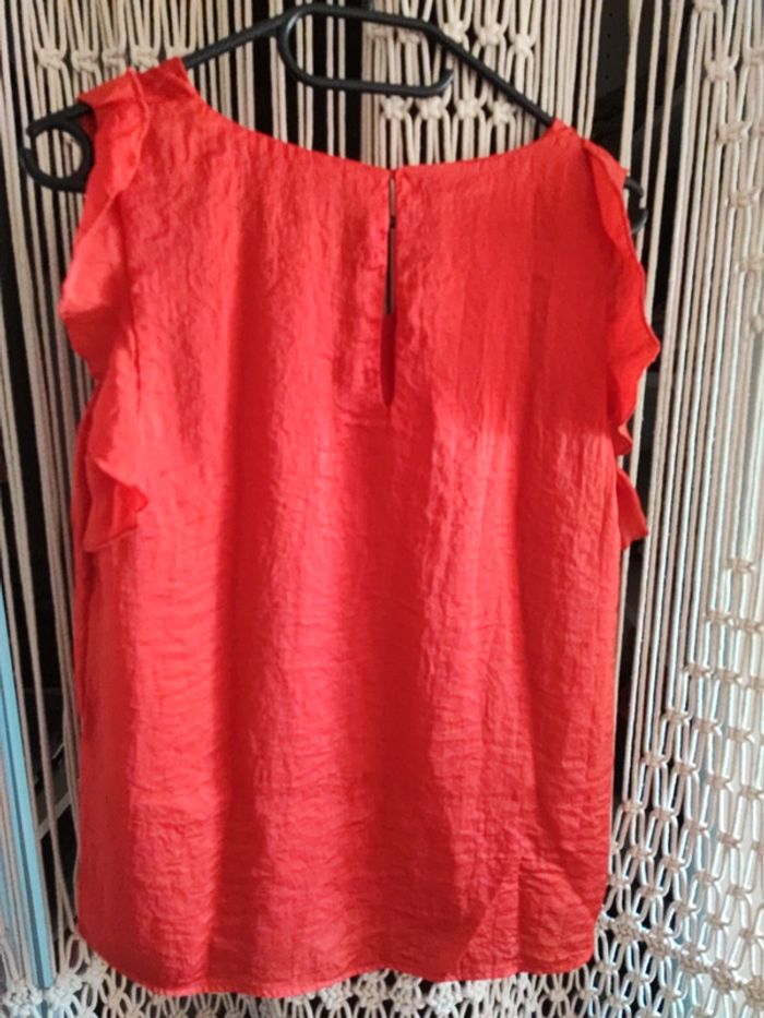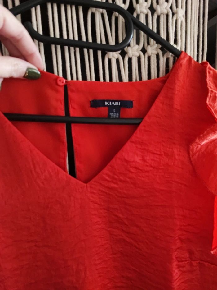 T-shirt effet blues sans manche de la marque Kiabi en taille S De couleur rouge matière un peu froissée et manche avec volant Taille un peu large En très bon état