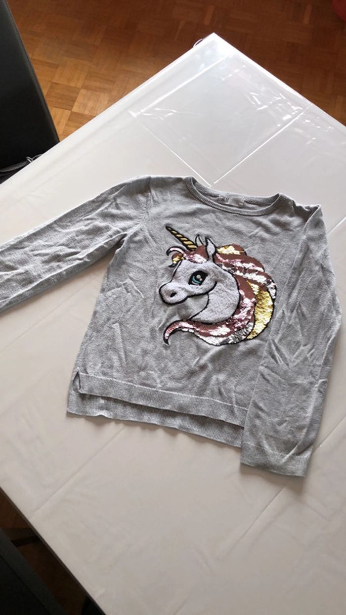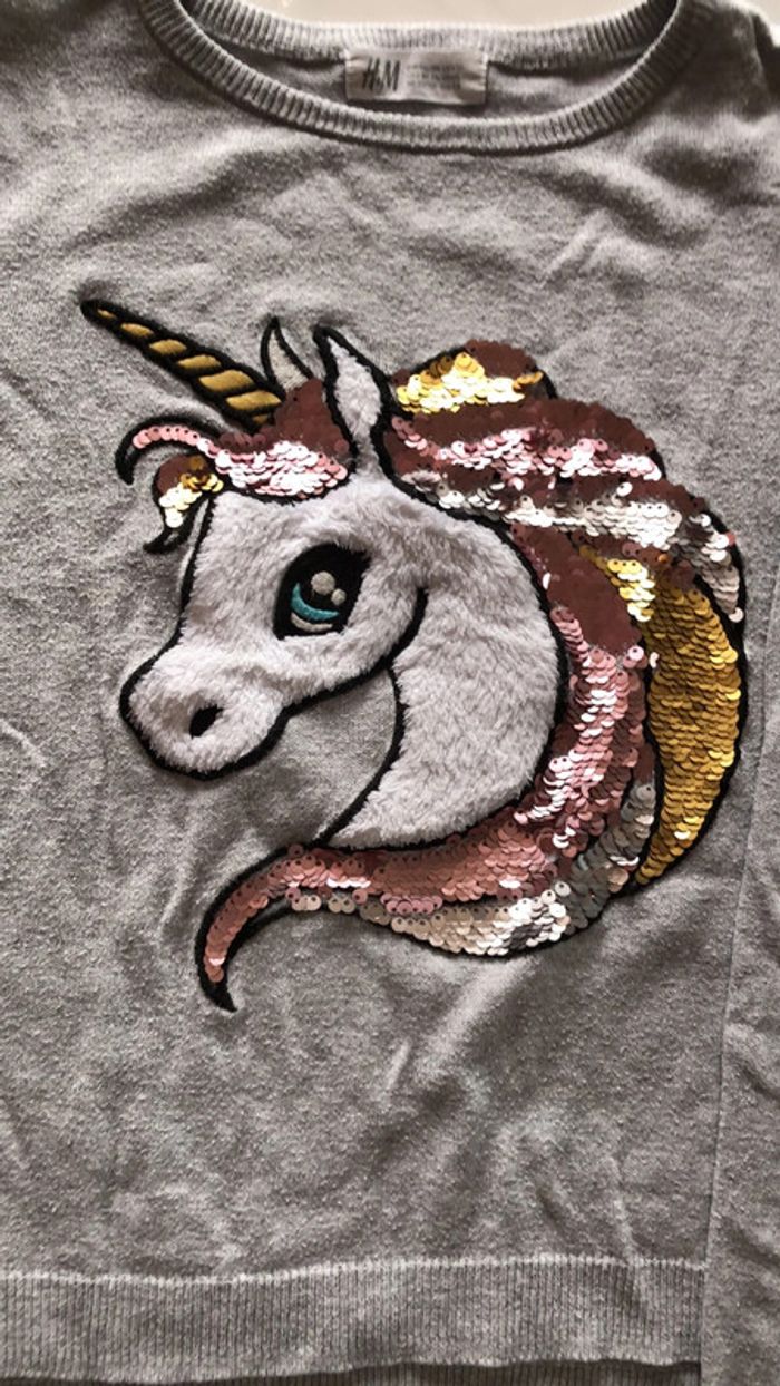 Pull licorne gris de chez H&M taille 6-8 ans 122/128. ⚠️ manche droite légèrement tachée. #fille8ans_elo