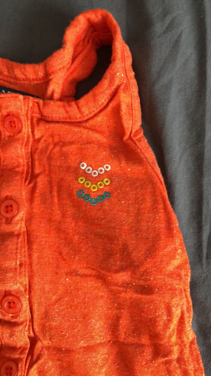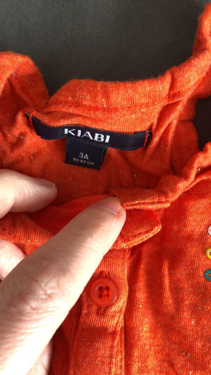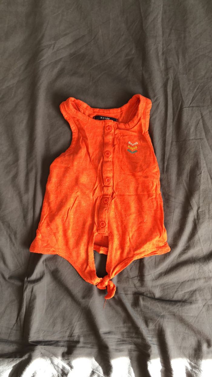 t-shirt sans manches orange pailletée avec petit nœud au nombril de la marque Kiabi en taille 3 ans #fille3ans_elo