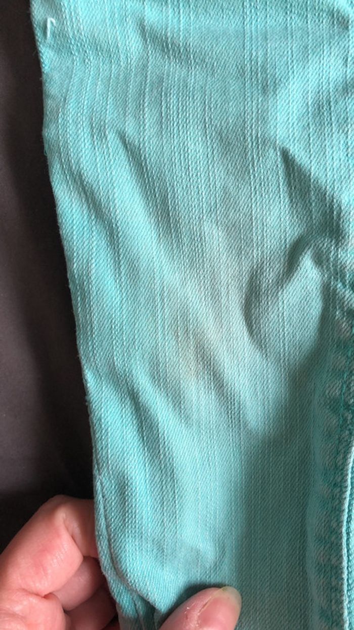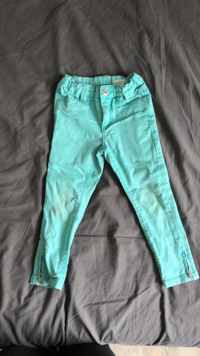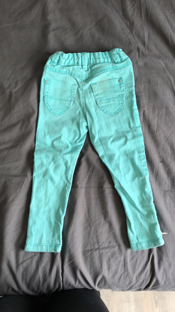 pantalon turquoise de la marque Vertbaudet en taille 3ans, fermetures zippées en bas des pattes, ⚠️ légère usure aux genoux #fille3ans_elo