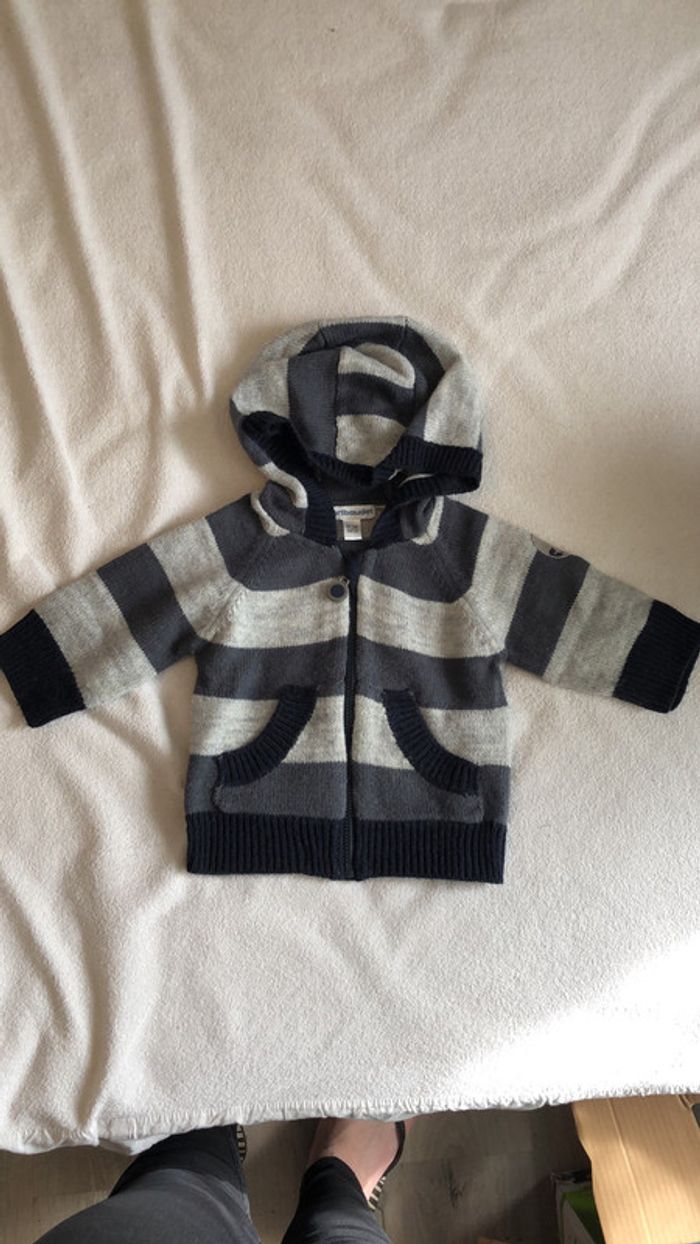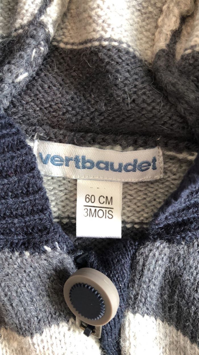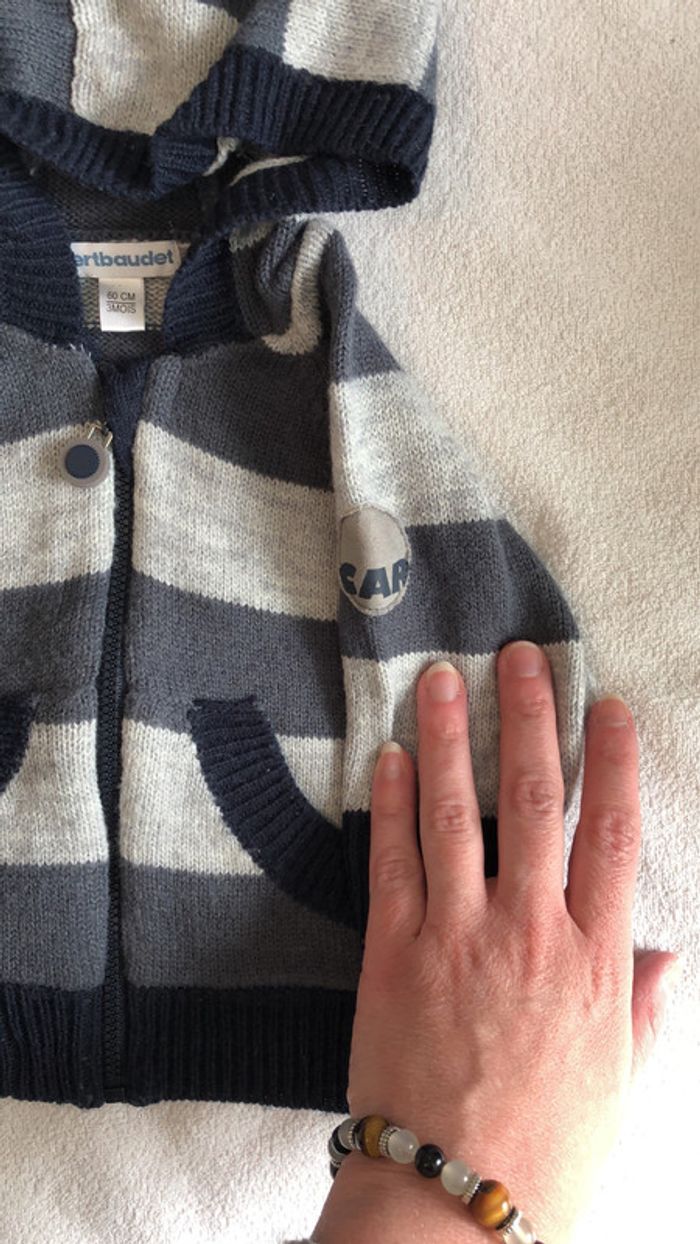 petit gilet en laine et acrylique de chez Vertbaudet en taille 3mois, rayé gris clair /gris foncé avec fermeture zippée et logo voiture au dos #bebegarcon3mois_elo