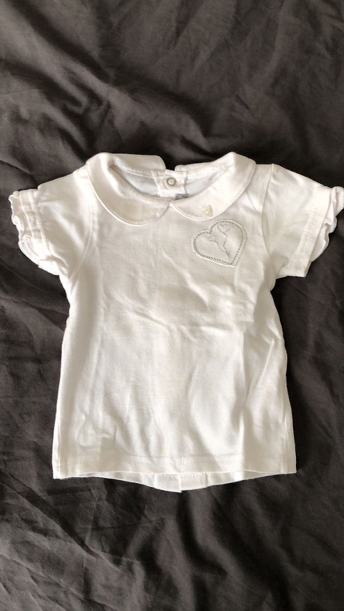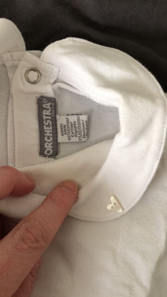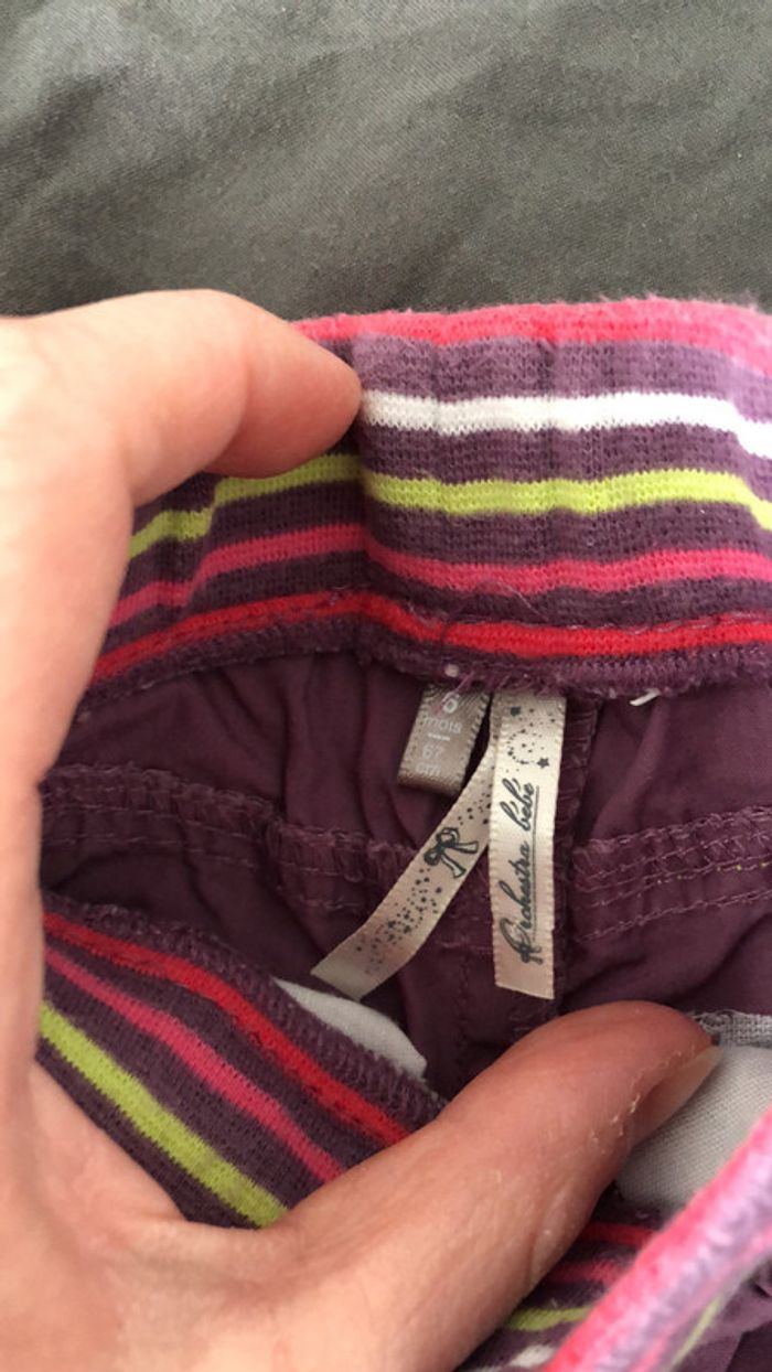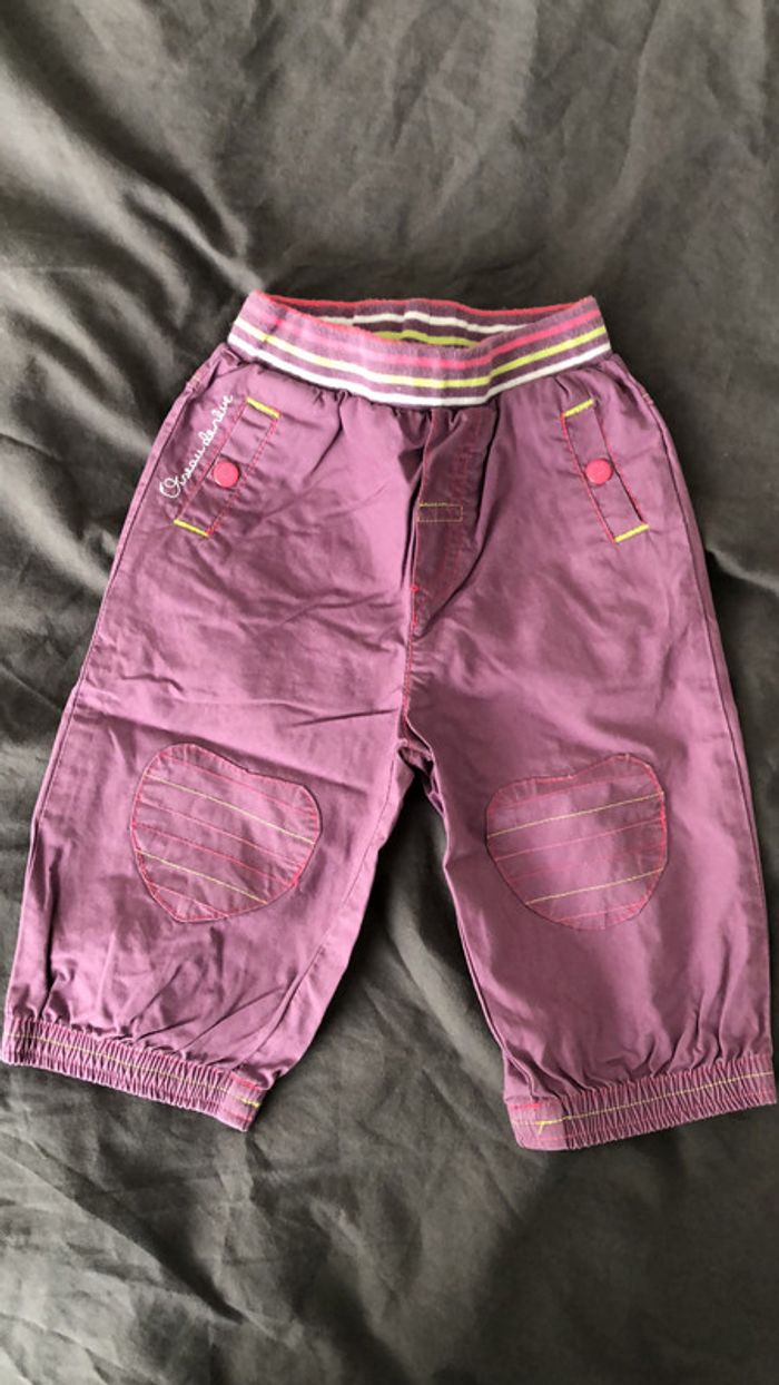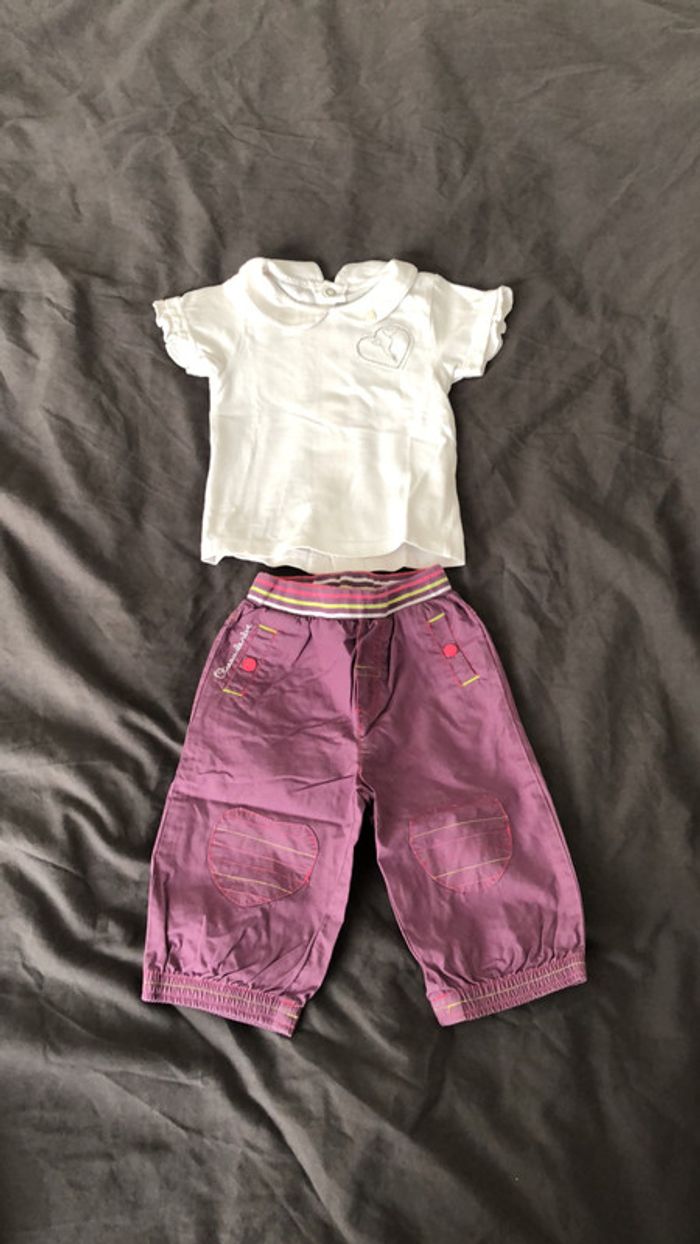 ensemble orchestra composé d’un pantalon violet et d’un teeshirt blanc fermé par des pressions sur tout le long du dos. # bebefille6mois_elo