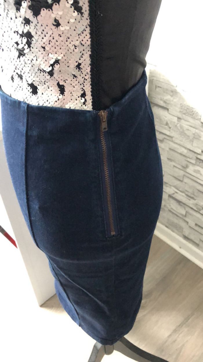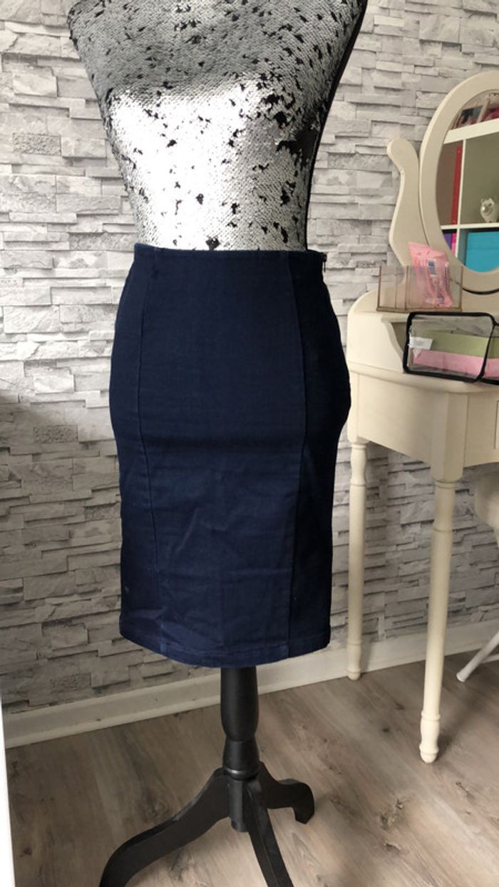 jupe en jeans moulante avec élastane bleue, arrivant juste au dessus du genou, légèrement fendue derrière avec ceinture élastique et qui se ferme sur le côté par une fermeture. De la marque Kiabi en taille 36. #jupe_elo