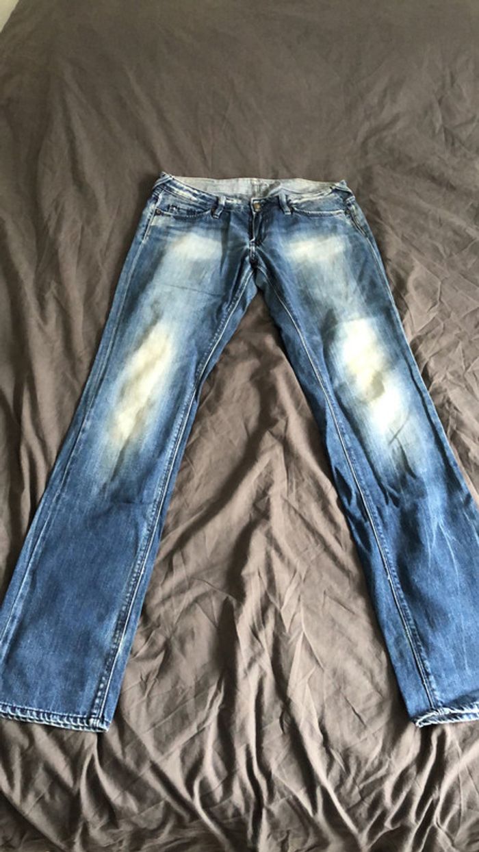 jeans bleu taille basse, évasé aux jambes de la marque le temps des cerises 🍒 en taille 27 #pantalon_elo