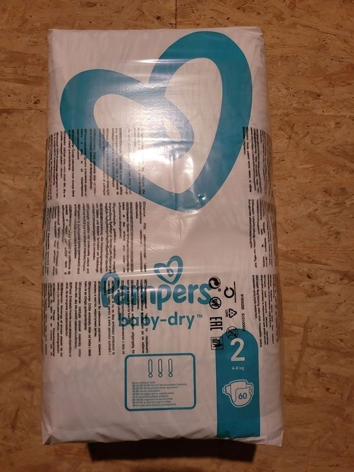 2 paquets de 60 couches pampers taille 2, soit 120 couches au total.