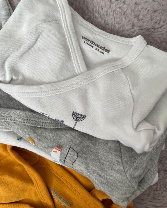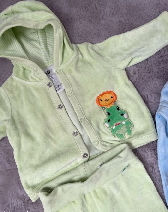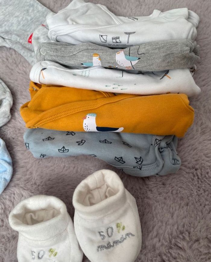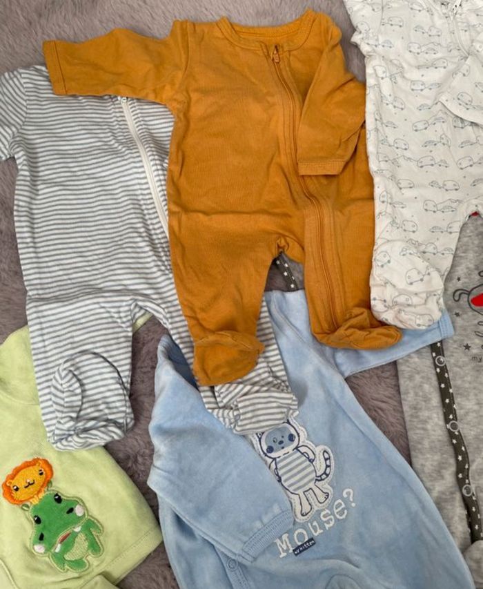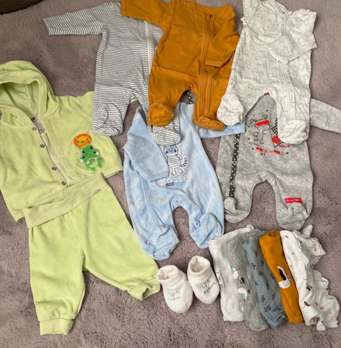 Maxi lot bébé garçon 1 mois naissance Lot naissance bébé (mixte) 1 mois 2 pyjamas velours naissance 3 pyjamas coton 1 mois 1 ensemble velours 1 mois 5 bodies 1 mois vert baudet et H&M certains articles sont neufs et d'autres ont été portés seulement quelques fois
