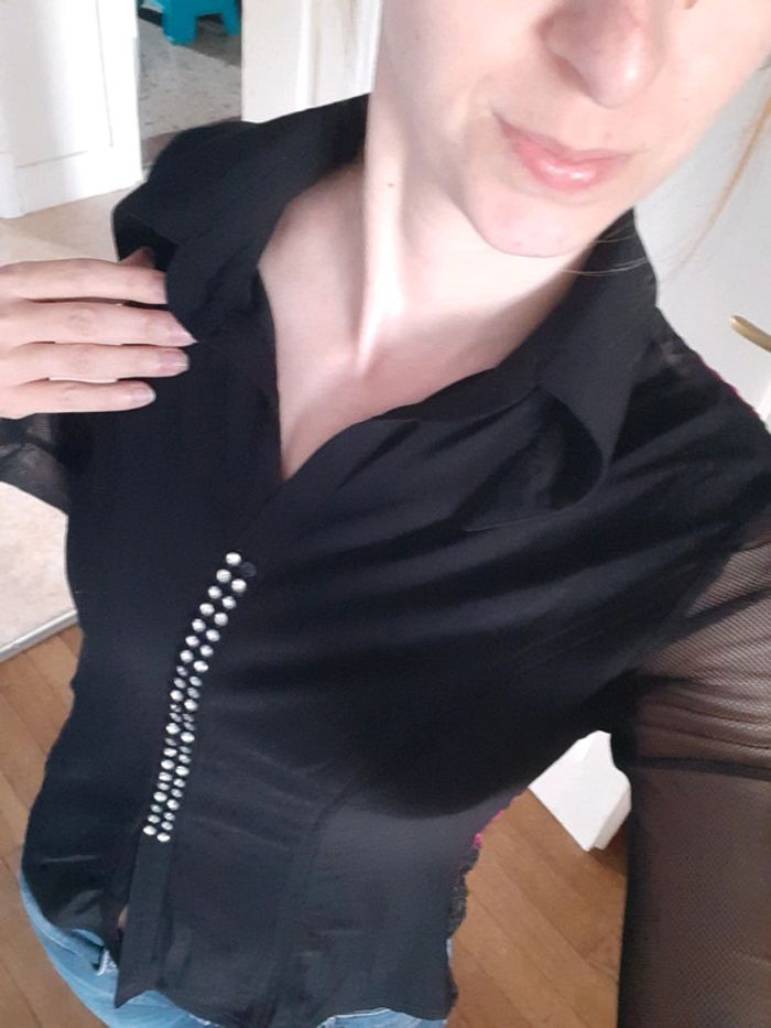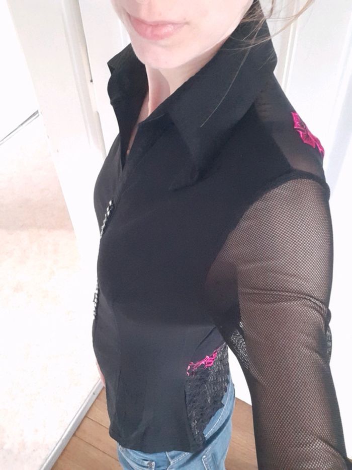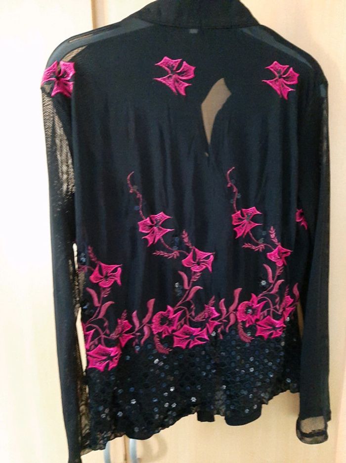 ‼️ Original et chic Haut chic noir avec col, strass sur le devant, et broderies roses et sequins dans le dos. Manches longues transparentes, petite ouverture sur le ventre. Très peu porté, bon état général. Retrouvez tous mes articles 👇 #catandco_34_36 #catandco_hauts