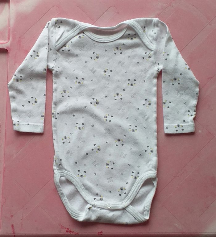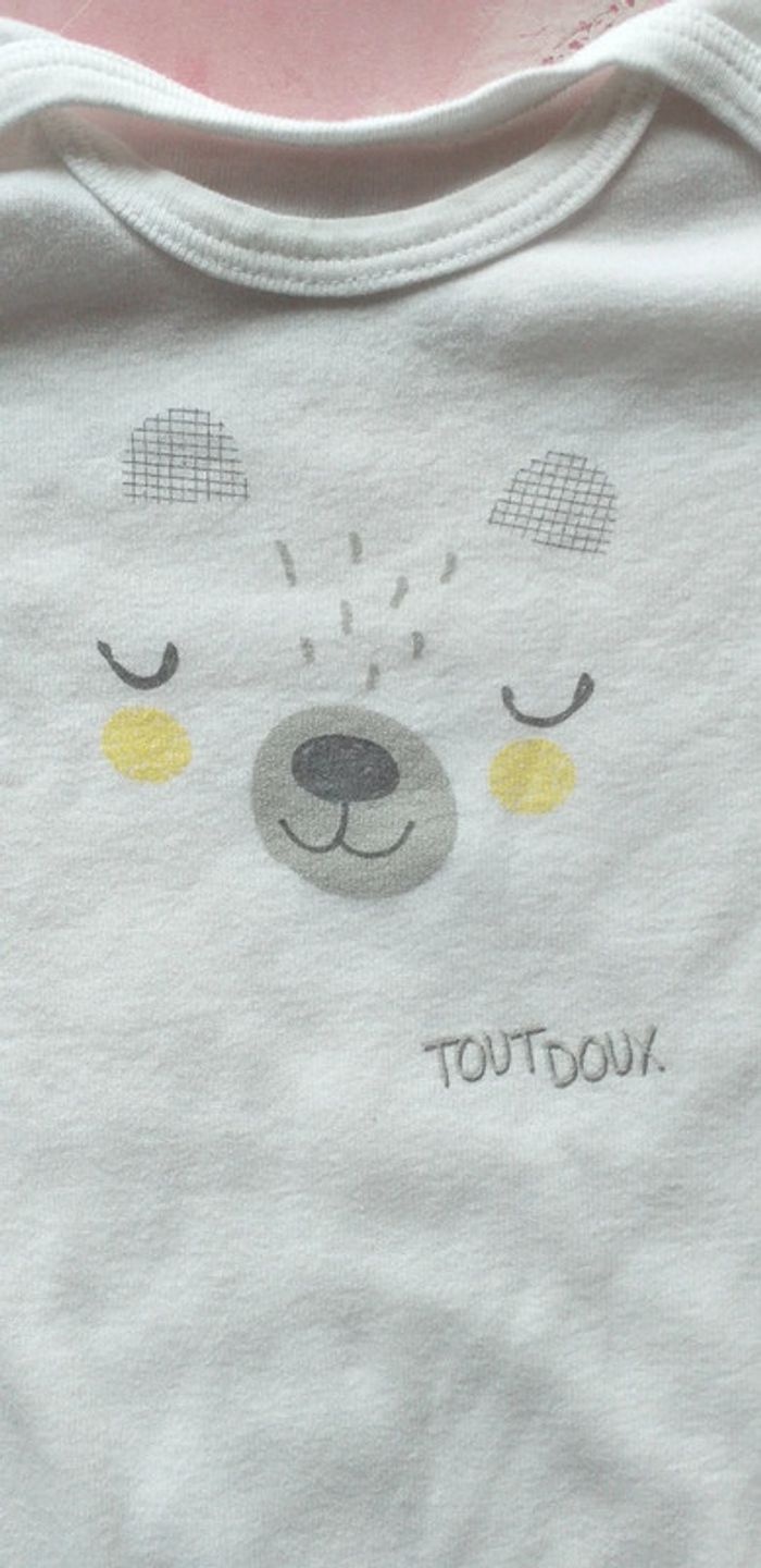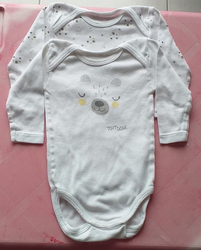 Porté plusieurs fois. Lot de 2 bodies avec des dessin de tête d'Ours. Les bodies s'enfilent par la tête et se ferme par boutons pressions au niveau de l'entrejambe. Taille 12 mois.