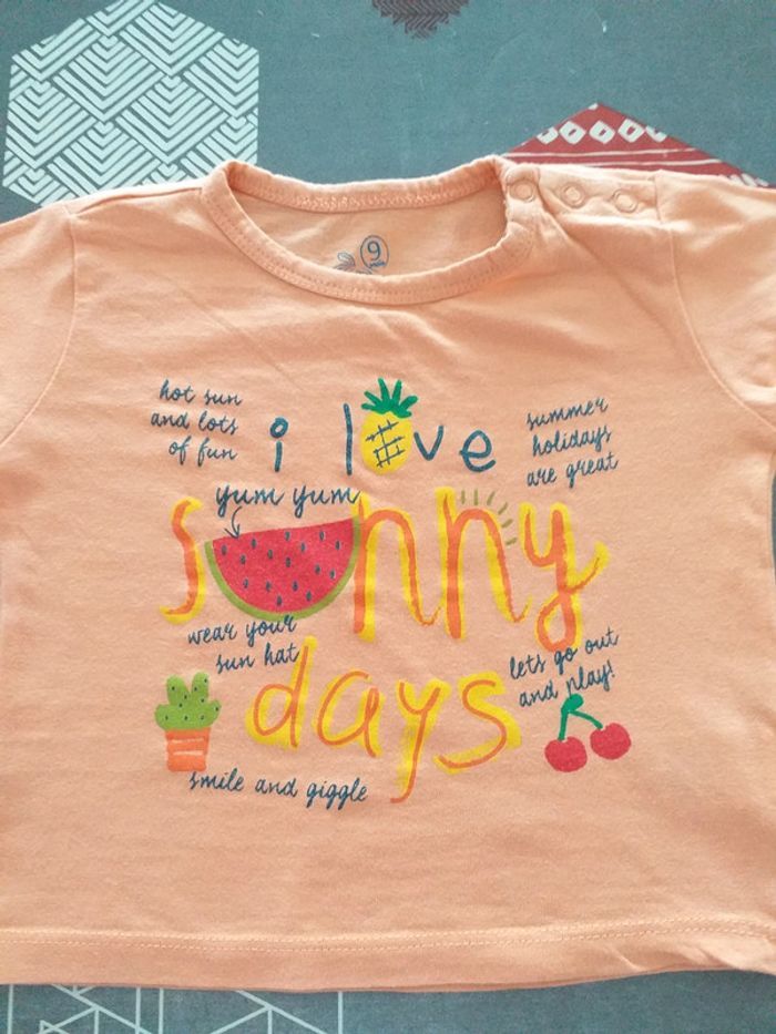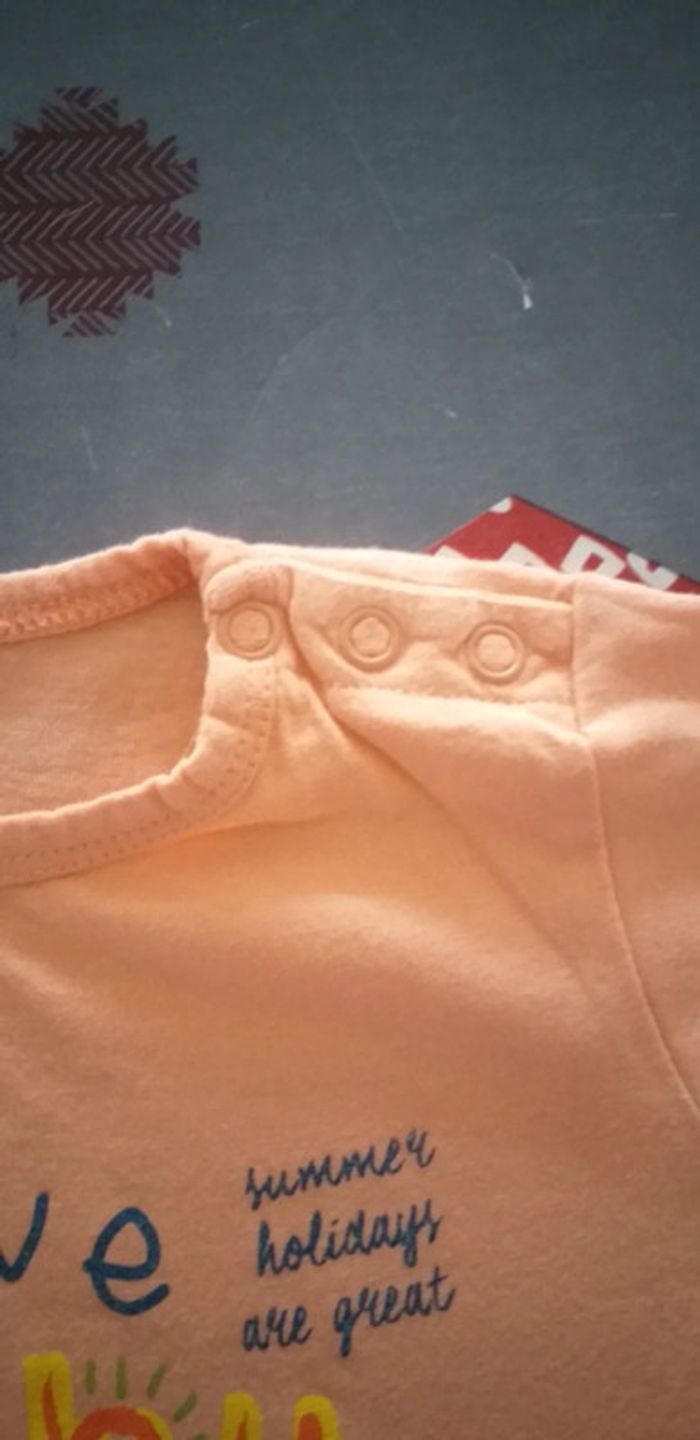 Porté plusieurs fois. Tee-shirt corail avec écriture. Fermeture par boutons pressions au niveau de l'épaule. Taille 9 mois.