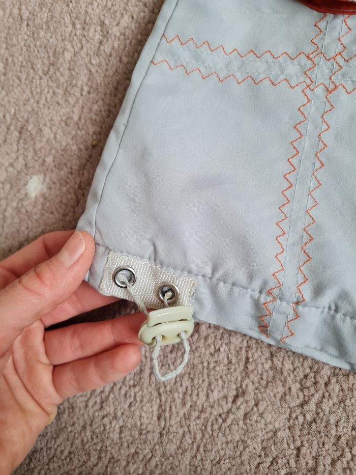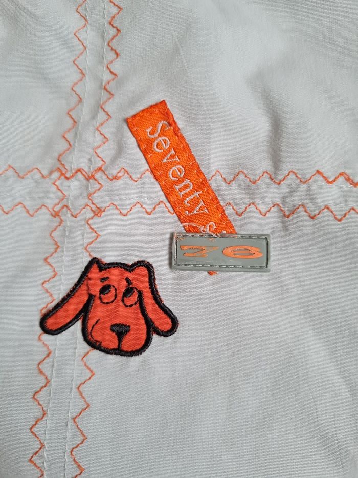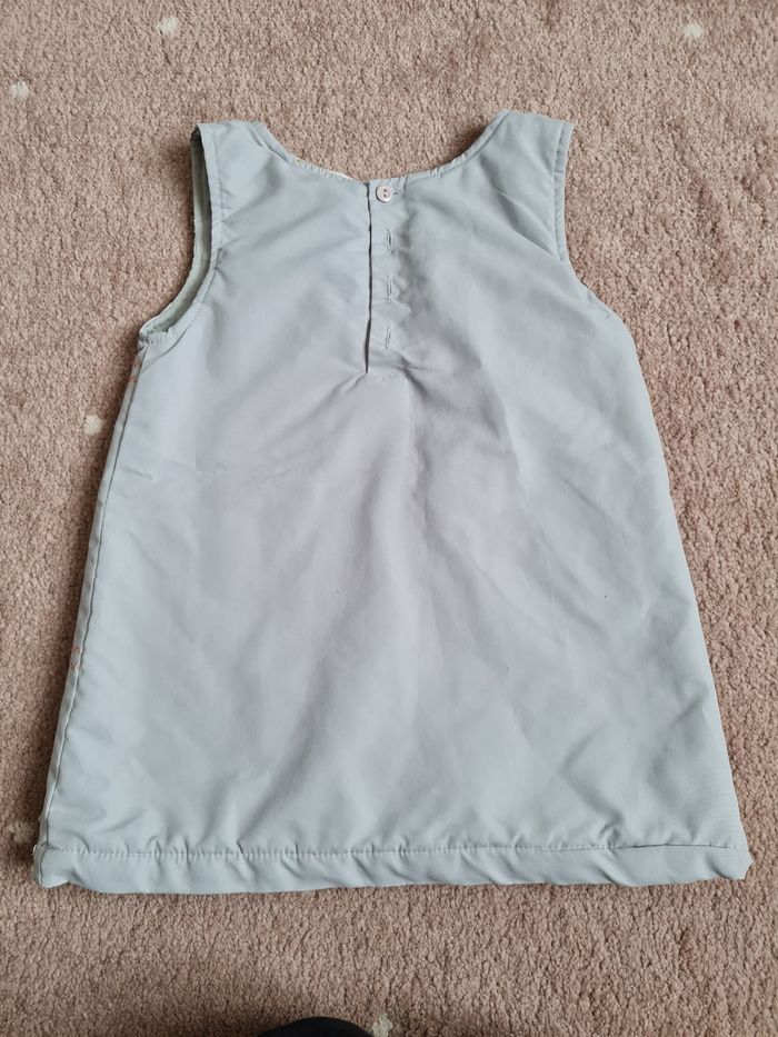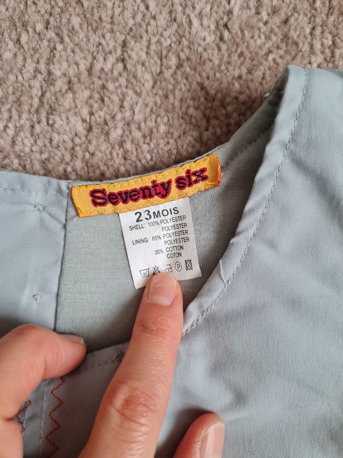 Robe sans manche bleu clair/grise taille 23 mois Seventy Six. Assez large, surpiqûres orange, motif chien, petite poche ronde zippée sur le devant, fermeture éclair au dos, liens de serrage "déco" à la base (ne se resserrent pas). Comme neuve
