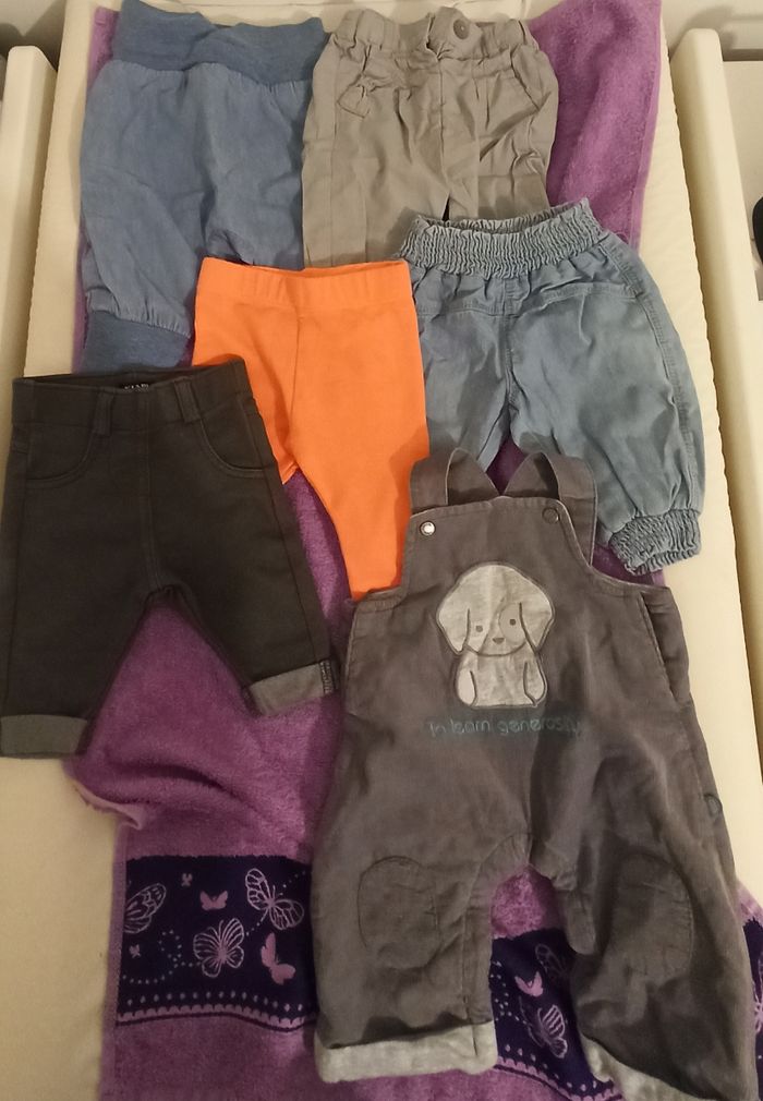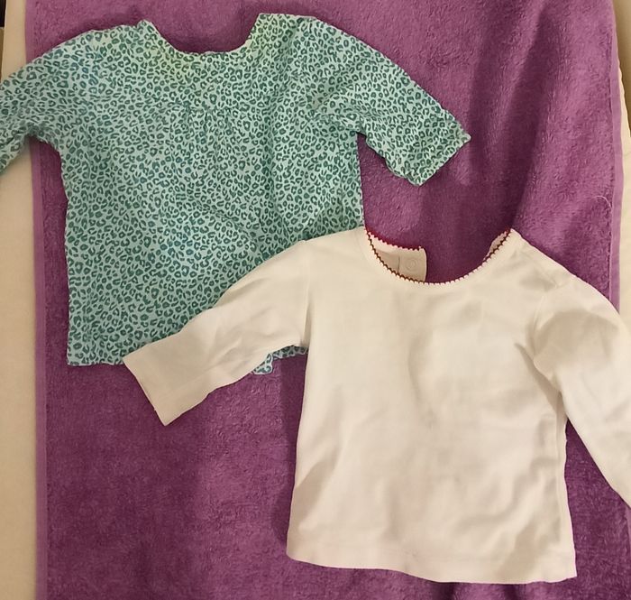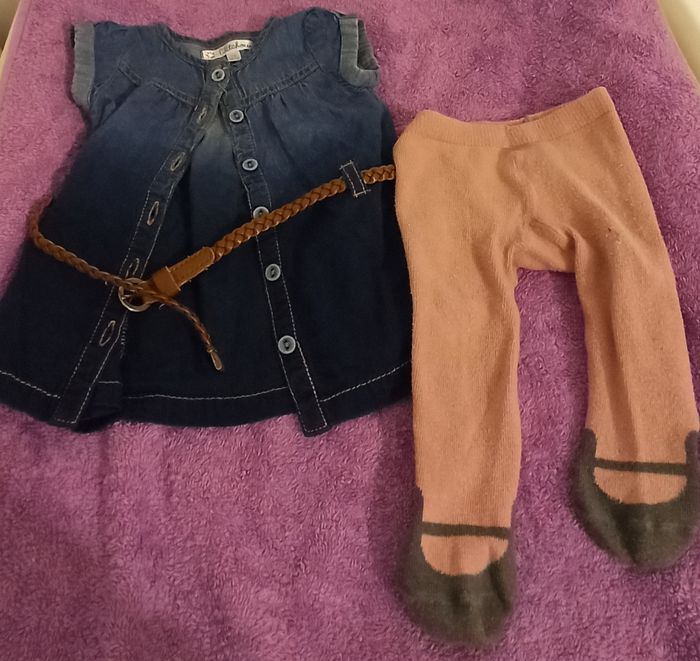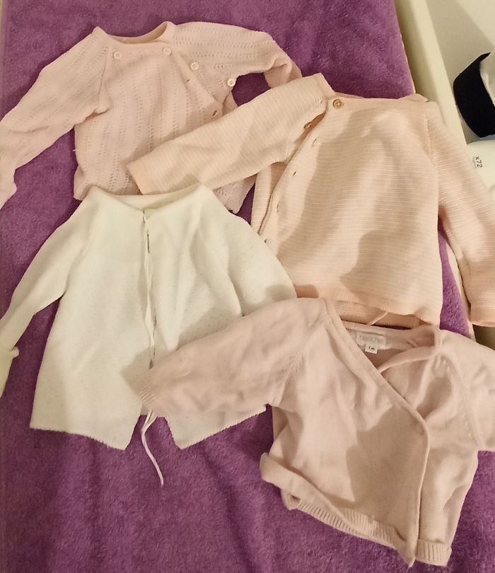 Lot de vêtements dissociable Les couleurs ne ressortent pas très bien sur les photos. Les gilets sont rose pâle et 1 blanc/crème et les collants sont rose Le t-shirt manches longues vert est jauni au niveau du col