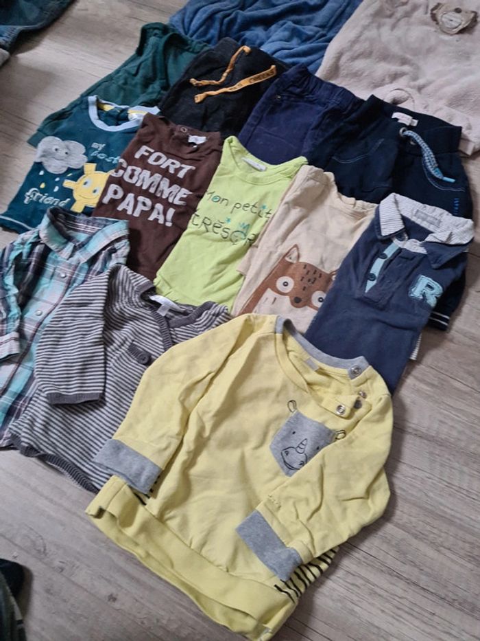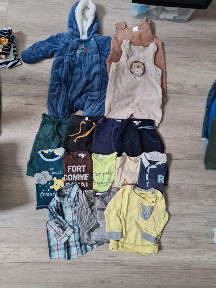 Tout en très bon état: 1 combipilote orchestra 2 salopette chaude 4 pantalon 5 t shirt manche longue 1 chemise 1 gilet fin 1 sweat. Diverse marque kitchoun, esprit, bébé rêve, kiabi.... Réduction sur les lots Envoi rapide par mondial relay #poppypopobbboys3mois