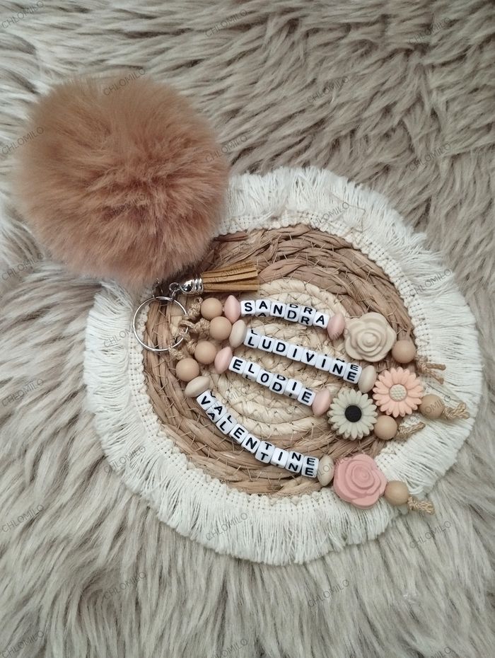 Porte clé personnalisé Couleur des perles, pompon et pampille a choisir selon vos goûts Vous pouvez choisir un prénom, un mot, des initiales... Possible de mettre plusieurs prénoms 1€50 par prénom supplémentaire