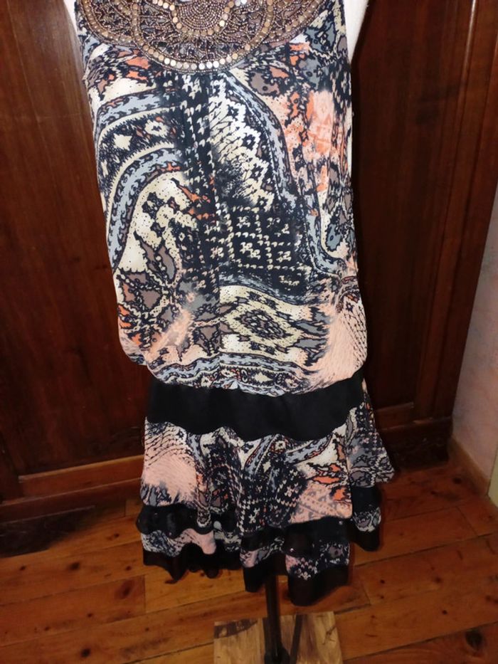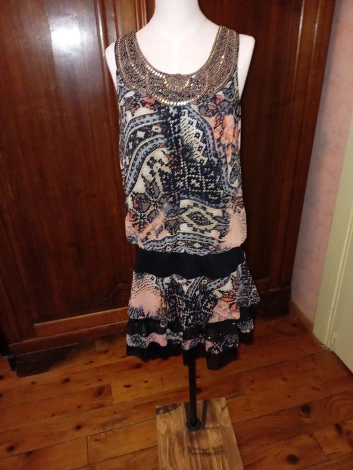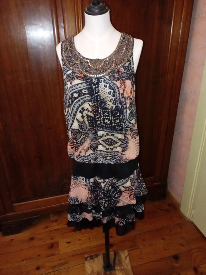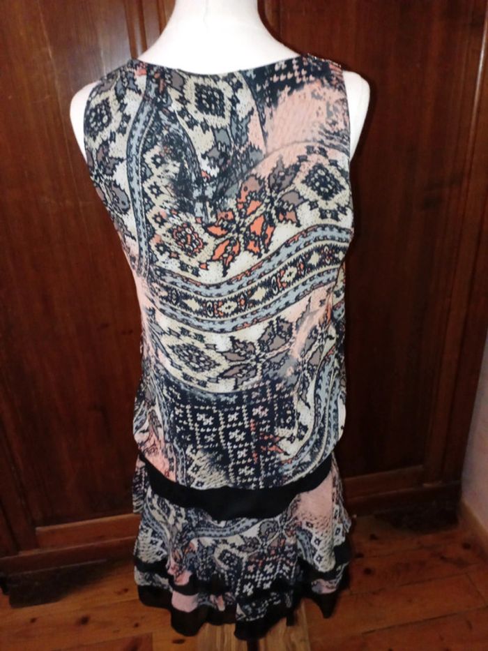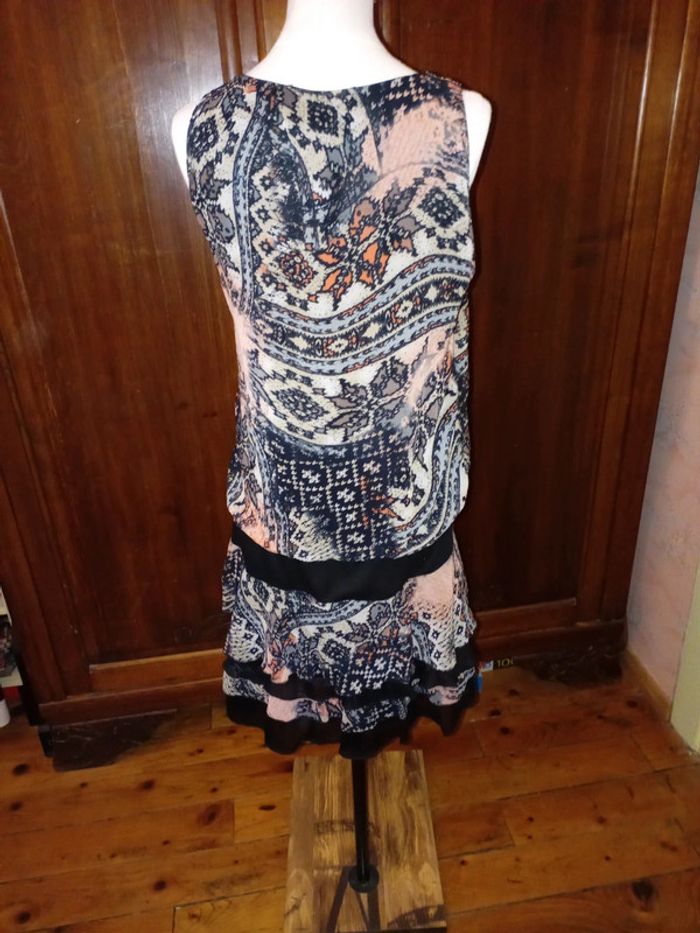 Robe sans manche Fluide et doublée. Bande élastique noire au niveau de la jupe Jupe à volants Magnifique plastron tour de cou Doublure intérieure Peut être portée en toute saison, avec ou sans sous-pull 100 % polyester Pas d'étiquette de taille mais correspond à une taille 38 En parfait état #robefemmeeilsel0 #hautfemmeT38eilsel0