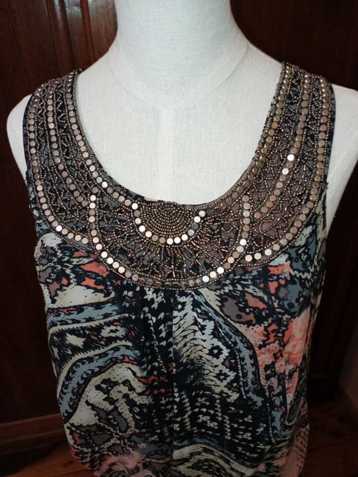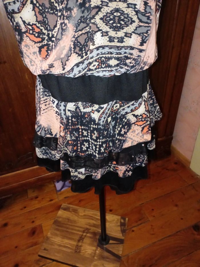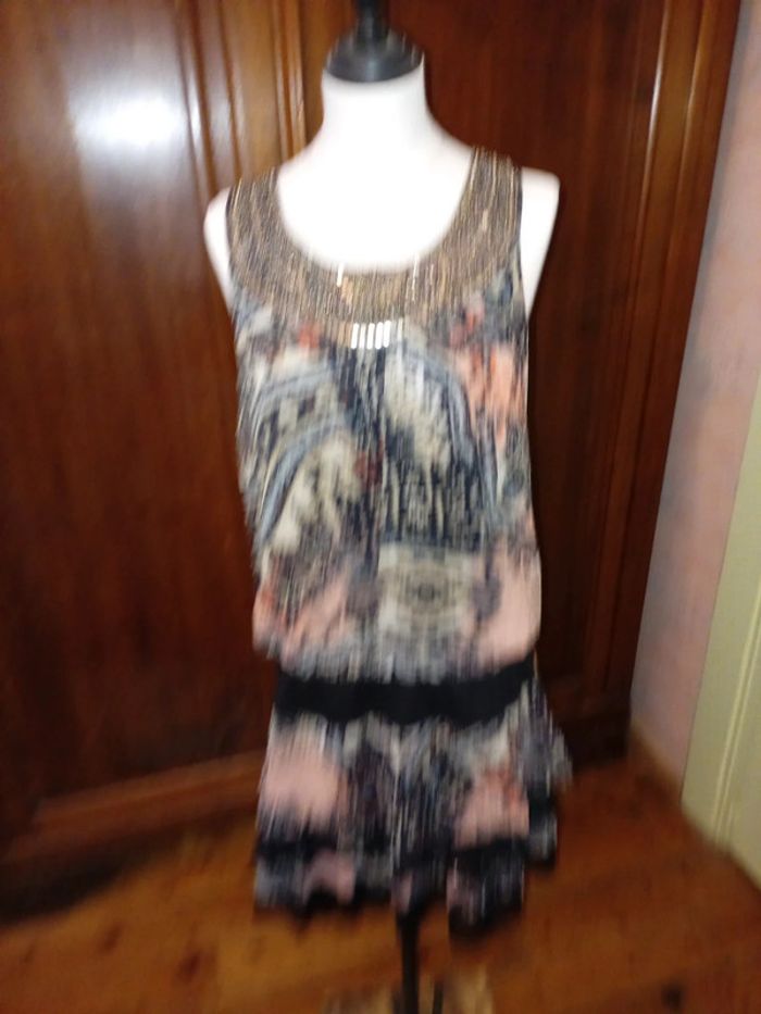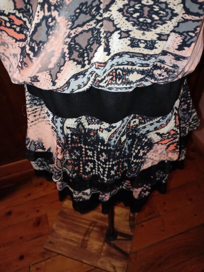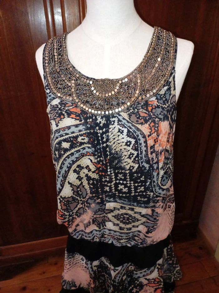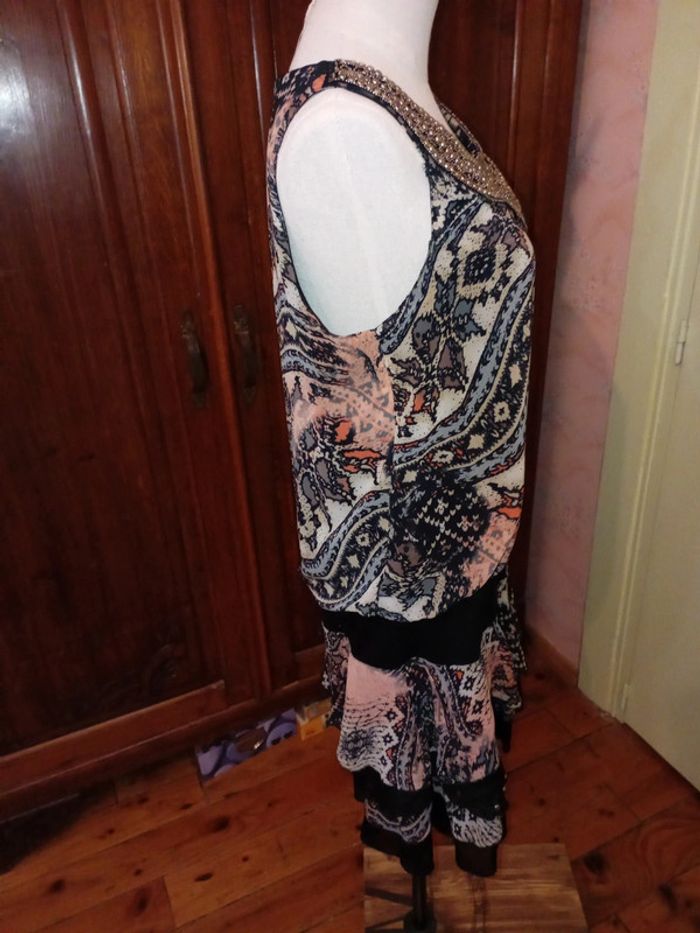 Robe sans manche Fluide et doublée. Bande élastique noire au niveau de la jupe Jupe à volants Magnifique plastron tour de cou Doublure intérieure Peut être portée en toute saison, avec ou sans sous-pull 100 % polyester Pas d'étiquette de taille mais correspond à une taille 38 En parfait état #robefemmeeilsel0 #hautfemmeT38eilsel0