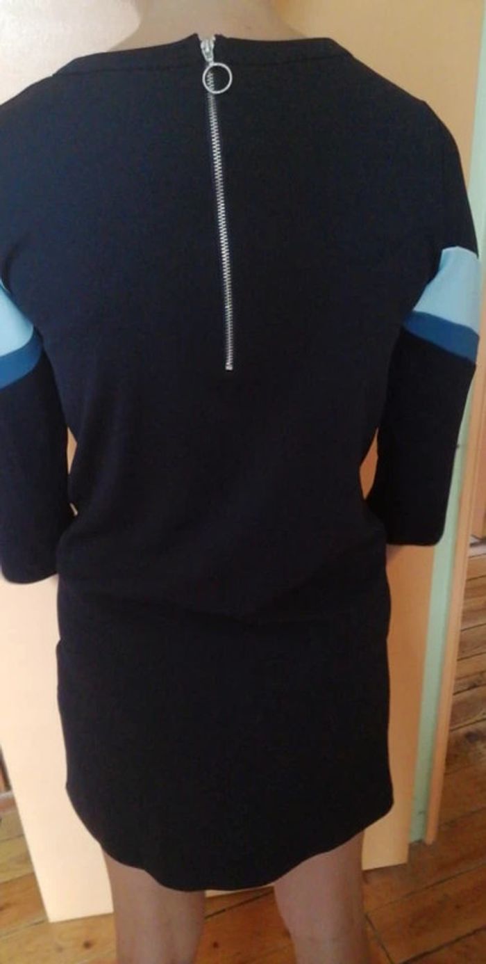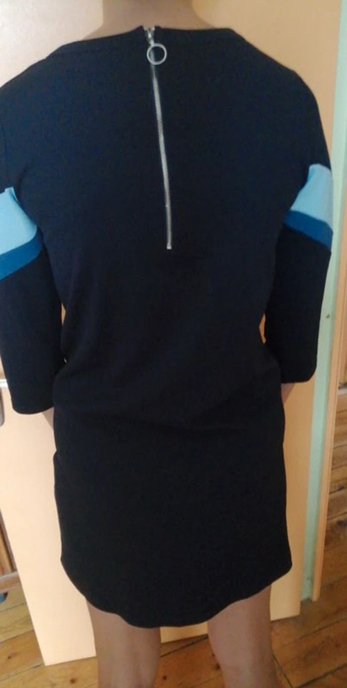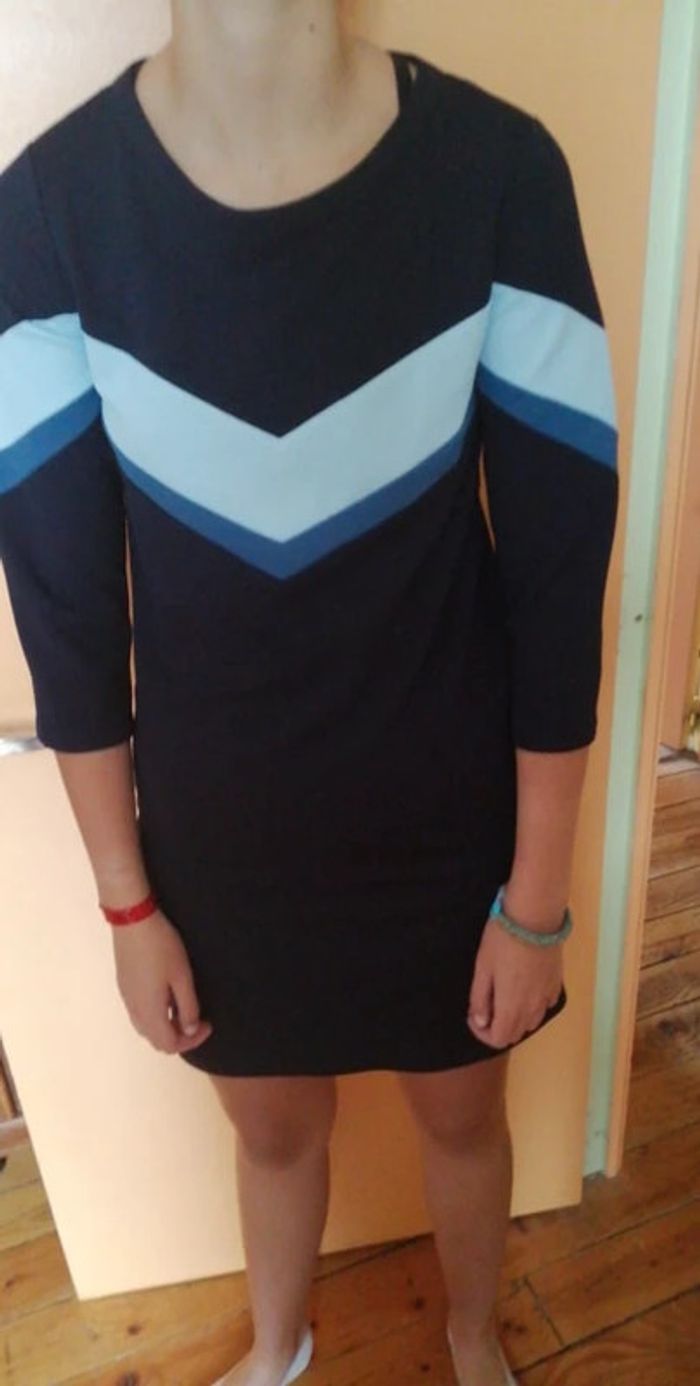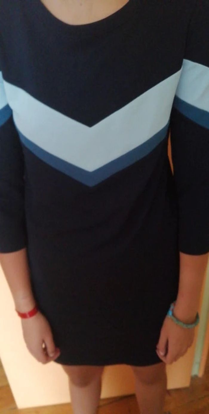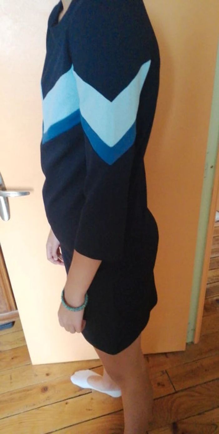 Jolie robe à manches 3/4 Neuve, jamais portée Bande avec 2 coloris de bleu en haut et manches Bleue marine unie dans le dos Une fermeture Eclair dans le dos 95 % polyester et 5 % élasthanne Taille 34 Mon mannequin du jour mesure 1,75 m et taille 34/36 #robefemmeeilsel0 #hautfemmeT34eilsel0 #articlesneufseilsel0